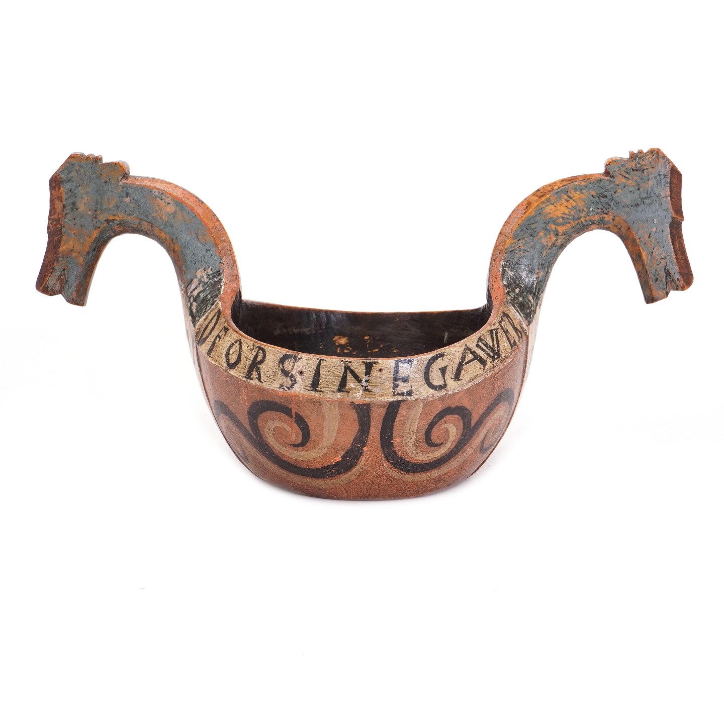 Norsk originaldekoreret ølbolle udskåret i træ med hanke i form af hestehoveder. Dateret 1803. H: 21cm. L: 41cm