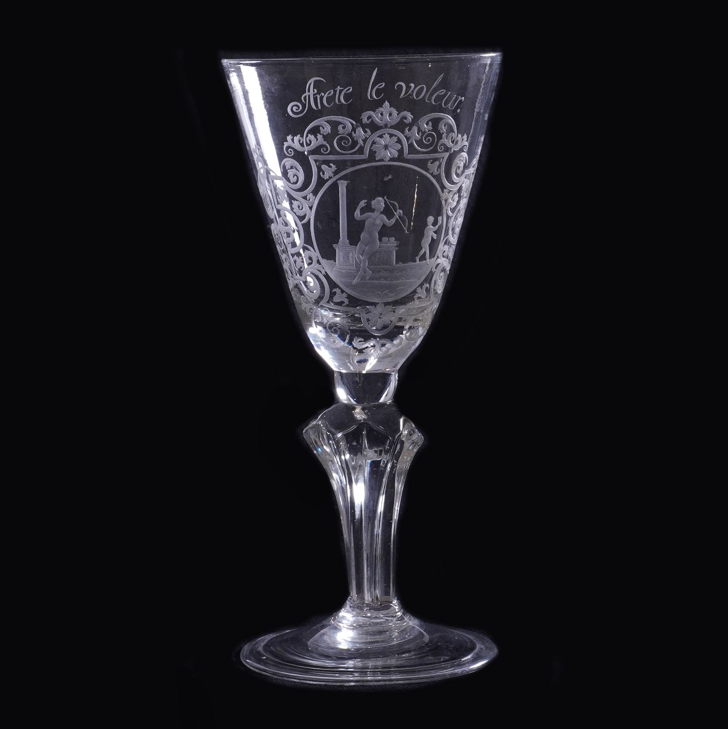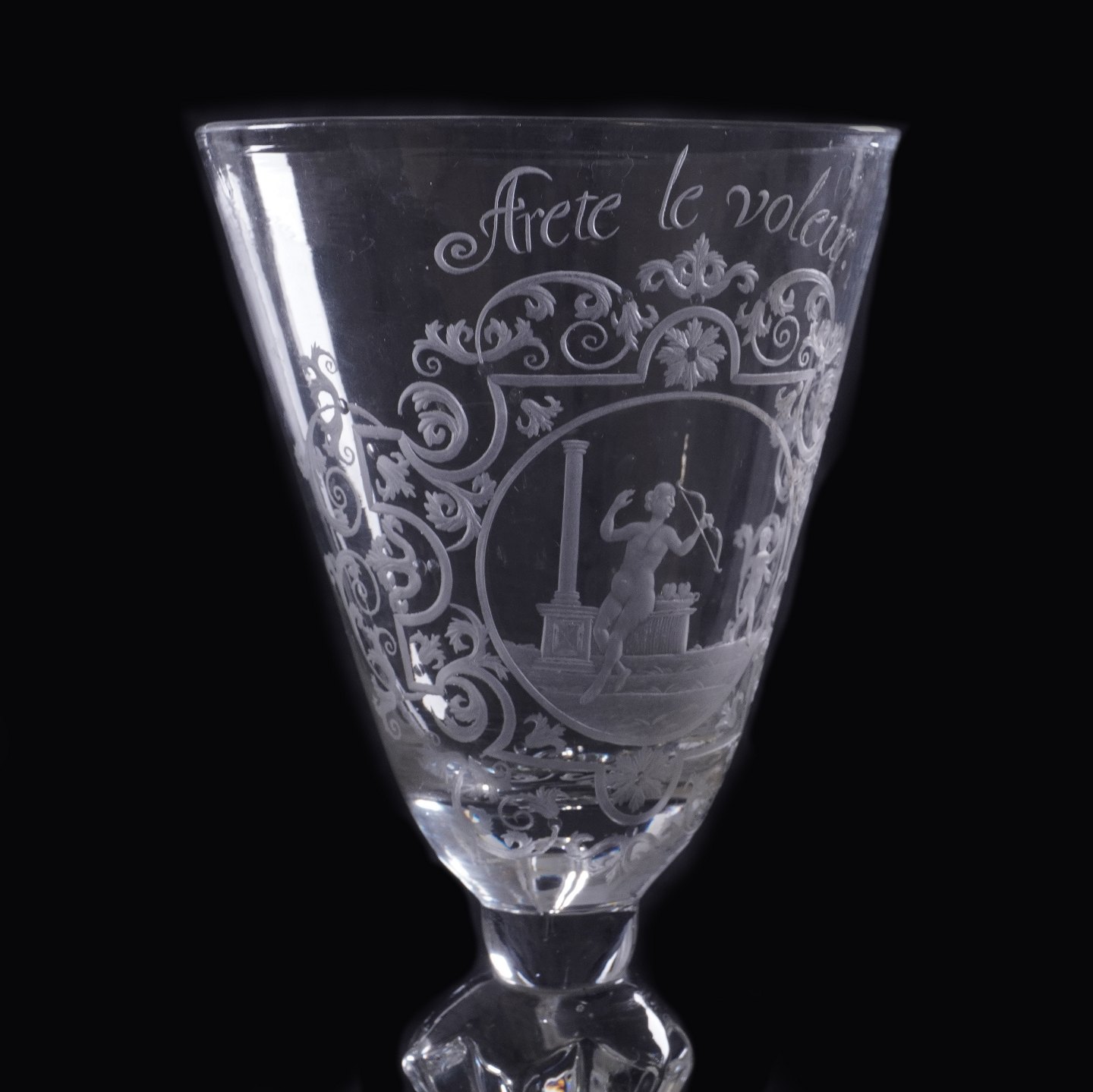 Glaspokal med graveringen "Arete le Voleur". Thüringen ca. år 1750. H: 20,5cm