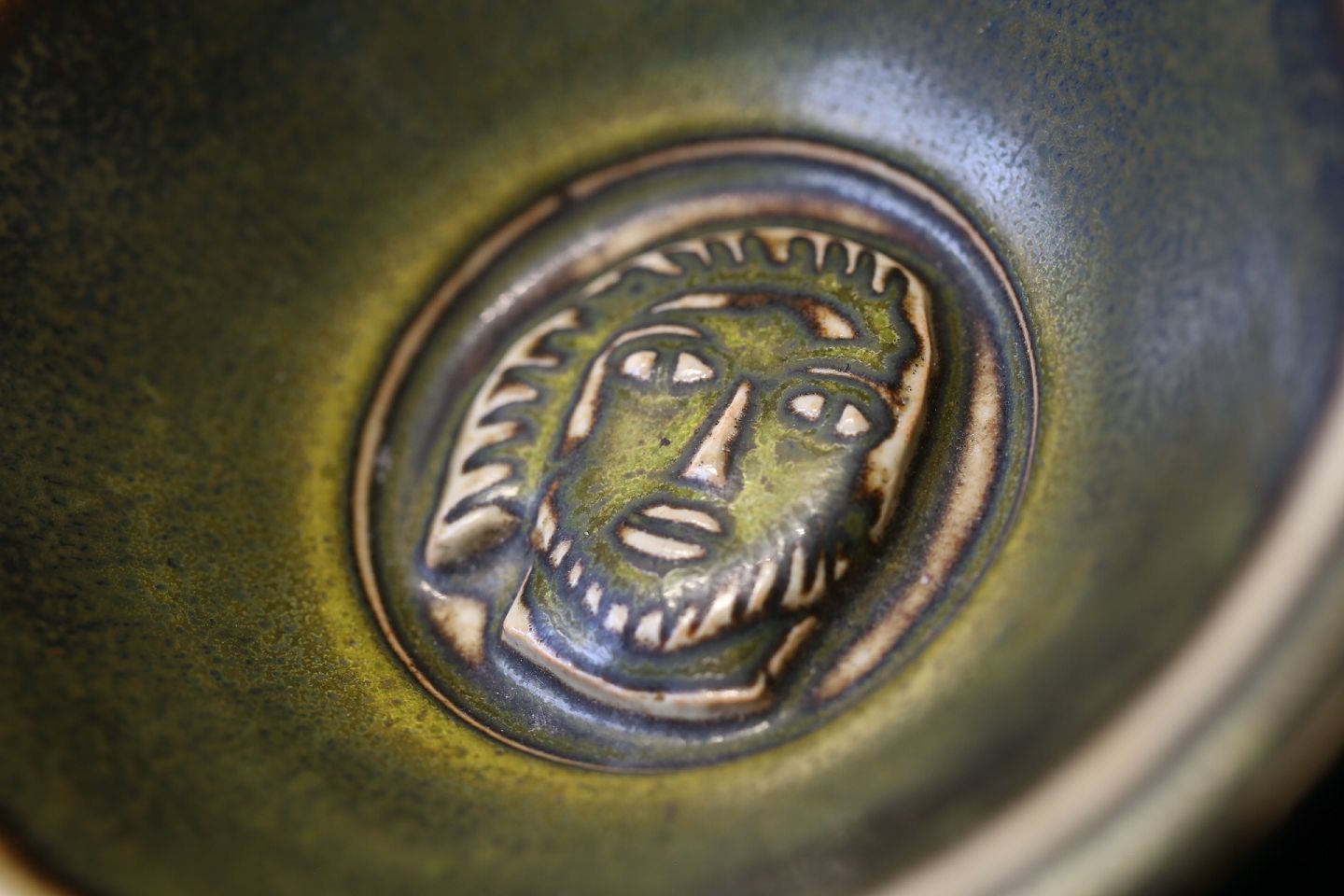 Jais bowl from Royal Copenhagen in nice olive green colour, with motif at the bottom of the bowl. The bowl has a nice design. The bowl can be used either for serving or as a decoration on the table.