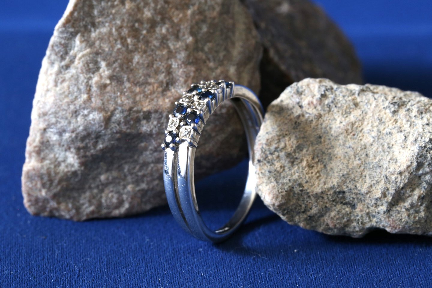 Gold ring in 9 carat white gold with blue sapphires, stamped 375 Chanti, size 58
