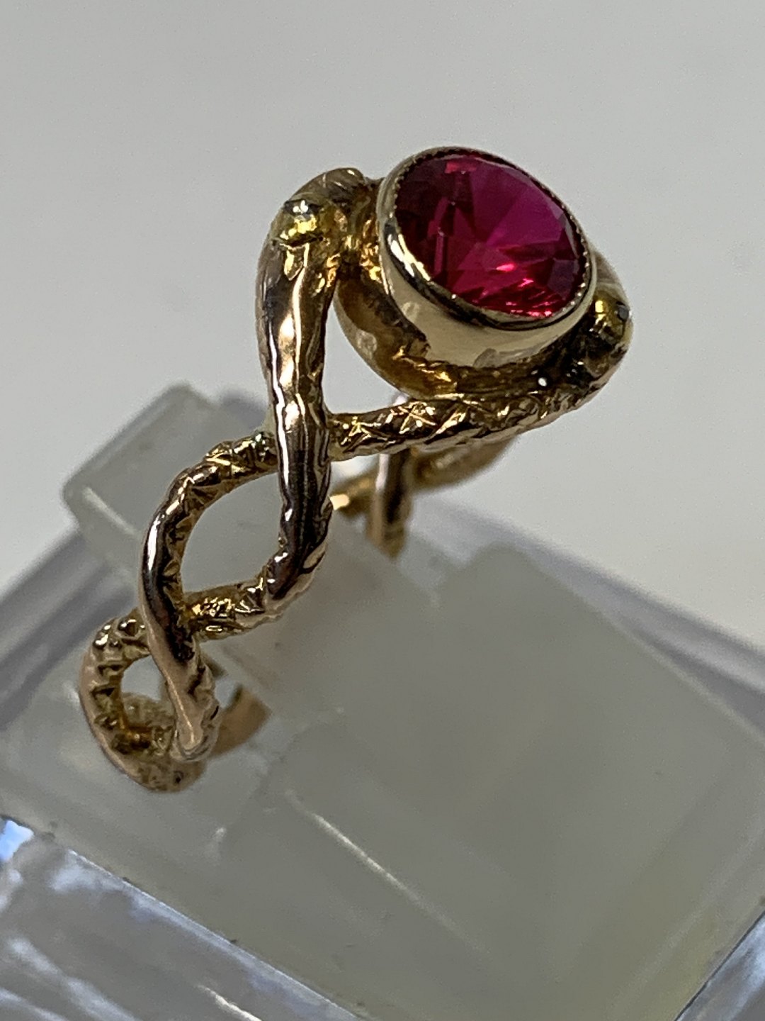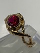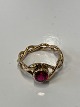 Smuk og elegant guldring med flot stor rød sten, og to mindre diamanter. Den røde sten giver ringen liv og styrke, men de to mindre diamanter reflekterer lyset, og giver ringen liv.