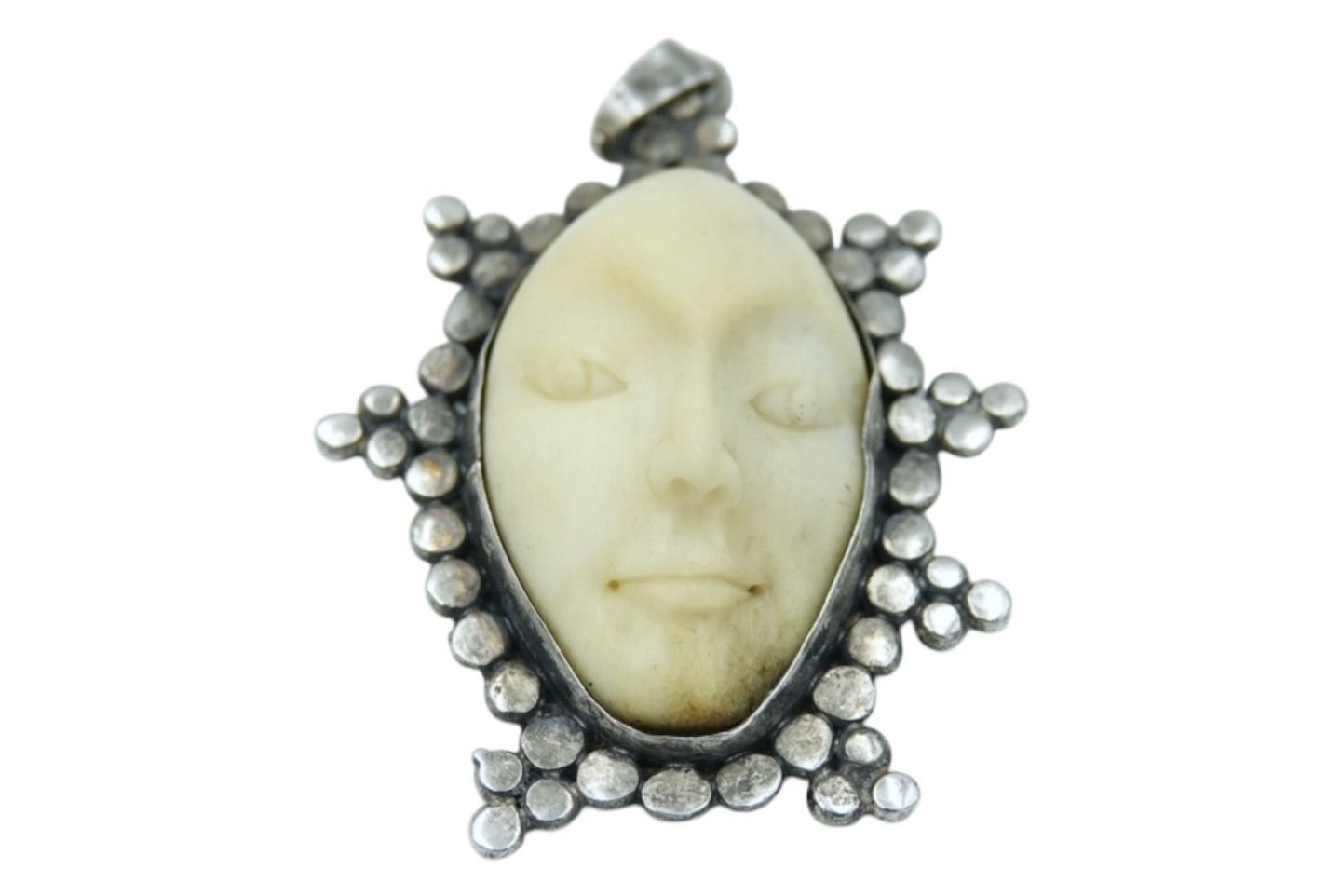 Large sterling silver pendant with face in bone. Hallmarked "925". Measures 4.1 by 3.5 cm. Excellent condition.
