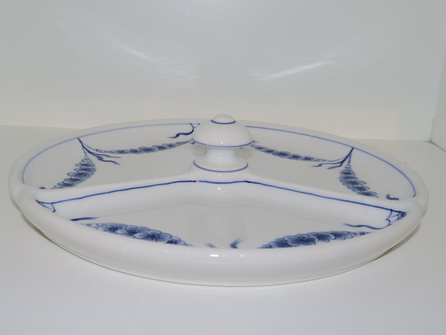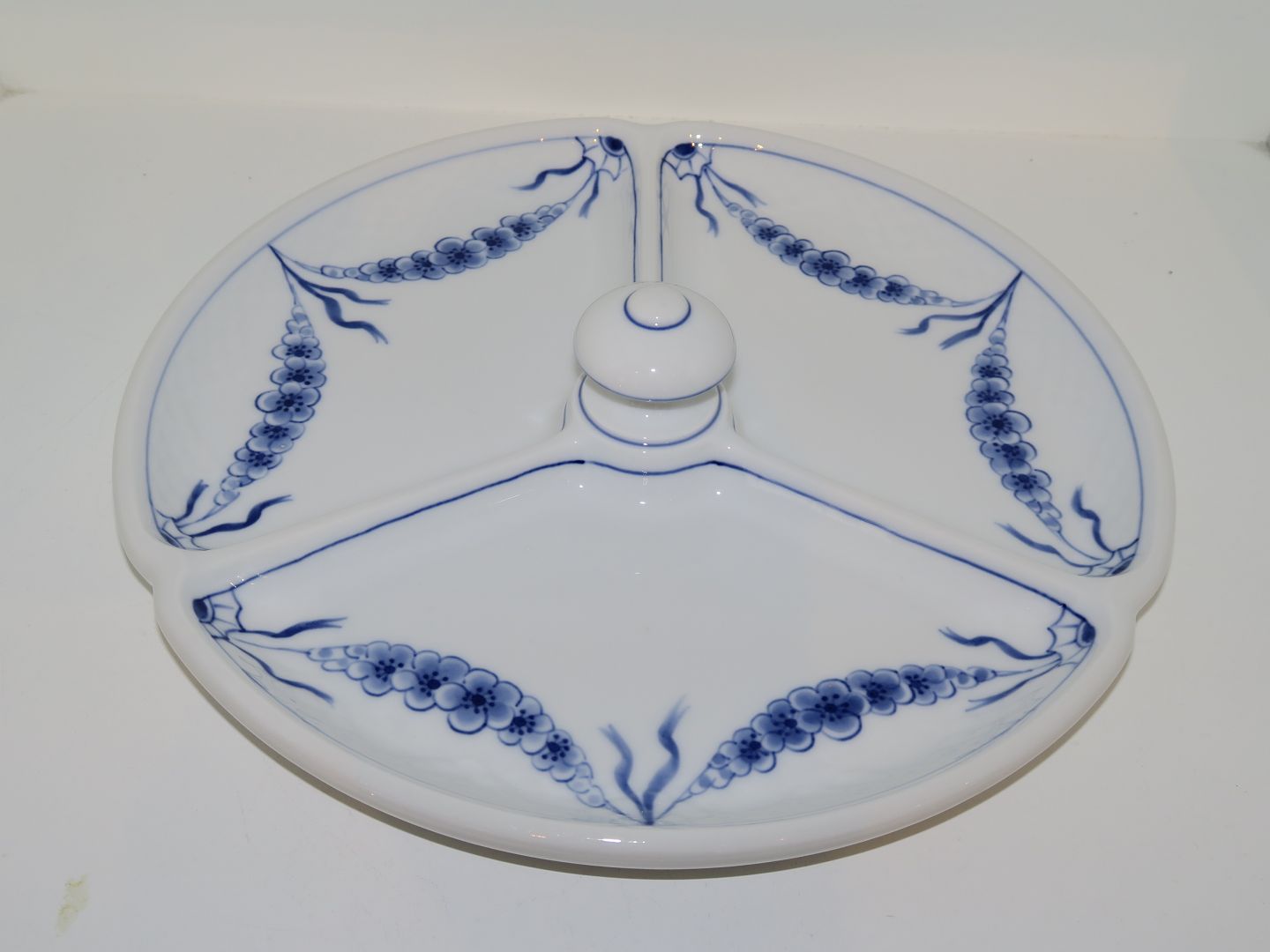 Bing & Grøndahl Empire, tre-delt rundt fad med knob. Fabriksmærket viser, at denne er fra mellem 1962 og 1970. Dekorationsnummer 221A. 2. sortering. Diameter 23,0 cm. Perfekt stand uden fejl.