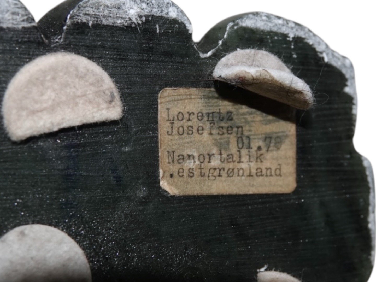 Mærkat i bunden med teksten "Lorentz Josefsen Nanortalik Vestgrønland 01.78"