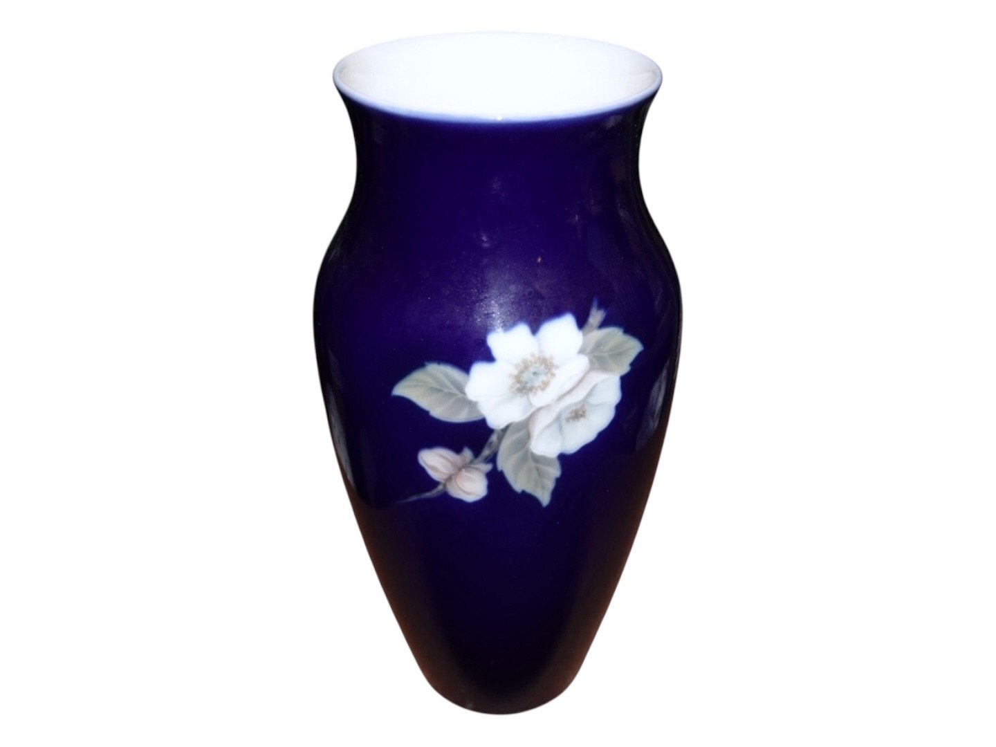 Høj mørkeblå Royal Copenhagen vase med æbleblomster.