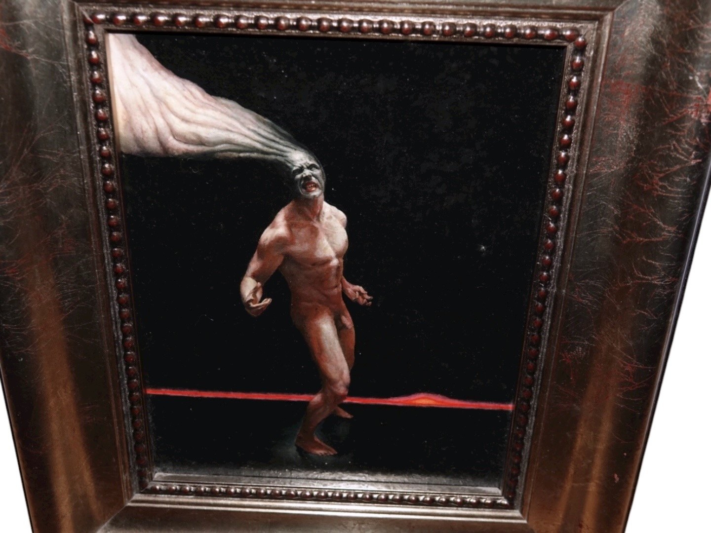 Akryl og oliemaleri af nøgen mand i bred sølvramme fra 2010.