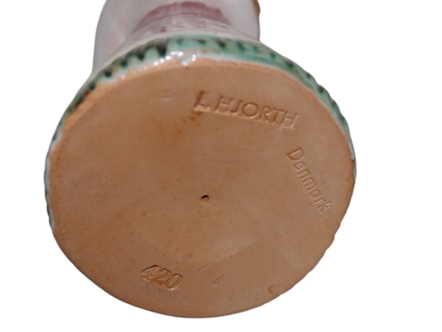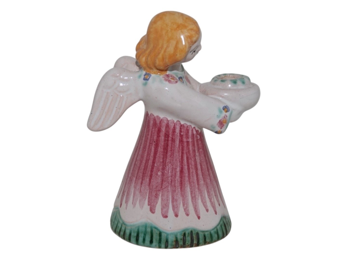 Hjorth Keramik, engel figur / lysestage med rød, grøn og gul dekoration. Dekorationsnummer 420. Højde 11,5 cm. Perfekt stand.