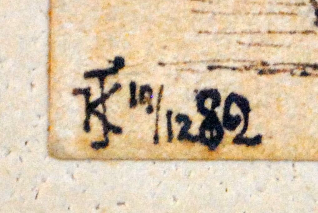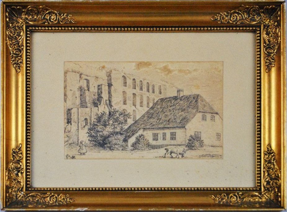 Jensen, Karl Georg (1851 - 1933) Danmark En lille pige ved Koldinghus. Tusch på papir. Signeret: Monogram KJ, 19. 12. 82. 18 x 12 cm.  Indrammet med hjørneornamenteret samtidig ramme. Tegningen er antagelig dateret op til jul - og en gave, idet motivet er fra sommeren.