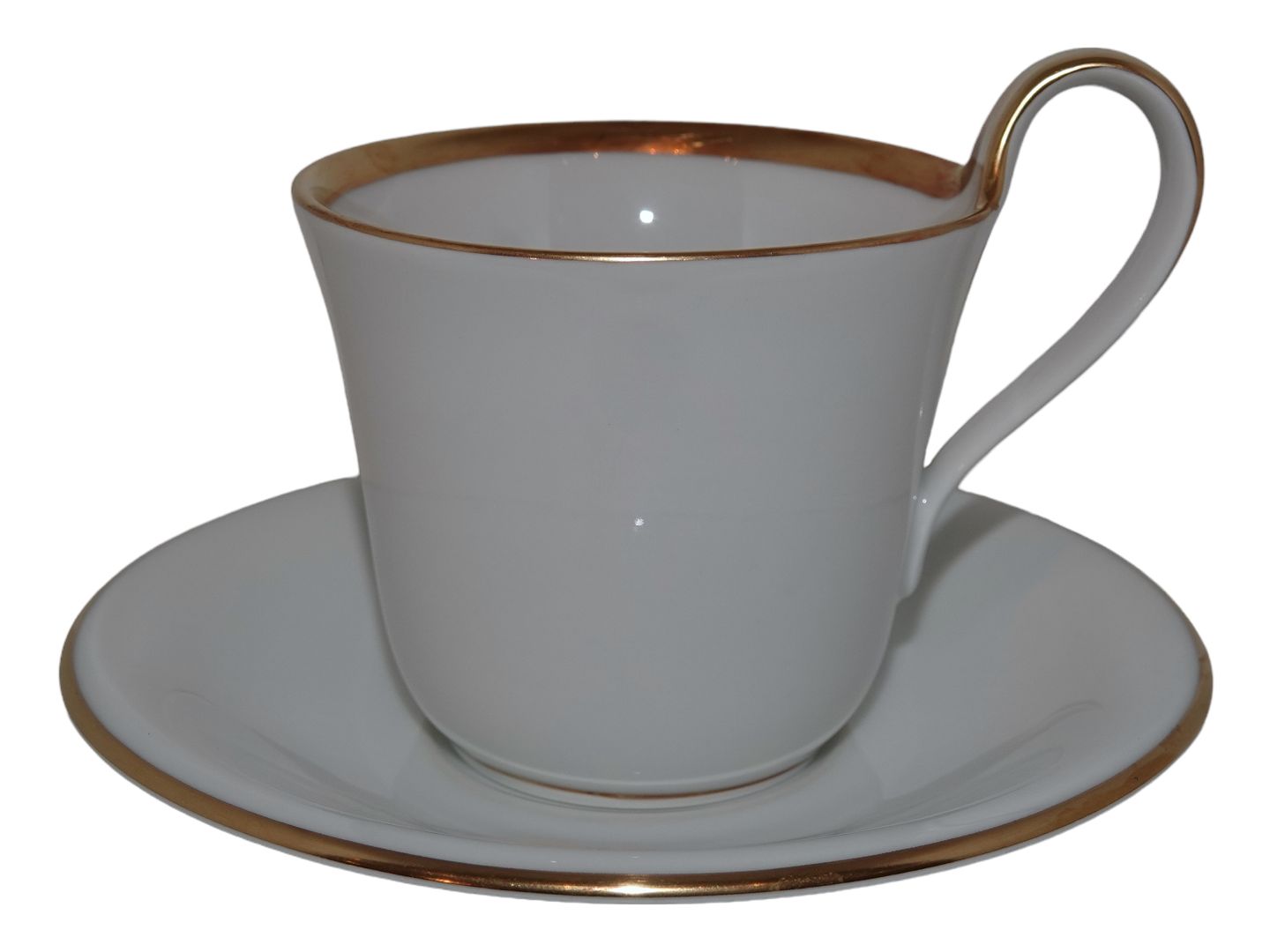 Bing & Grondahl Jet'aime, white high handle coffee cup with gold edge and saucer.