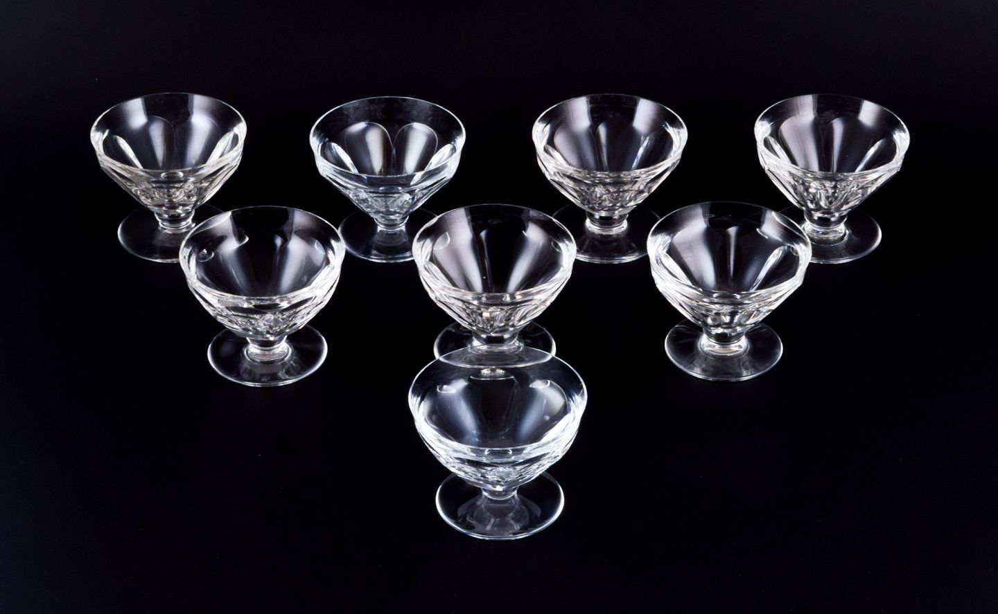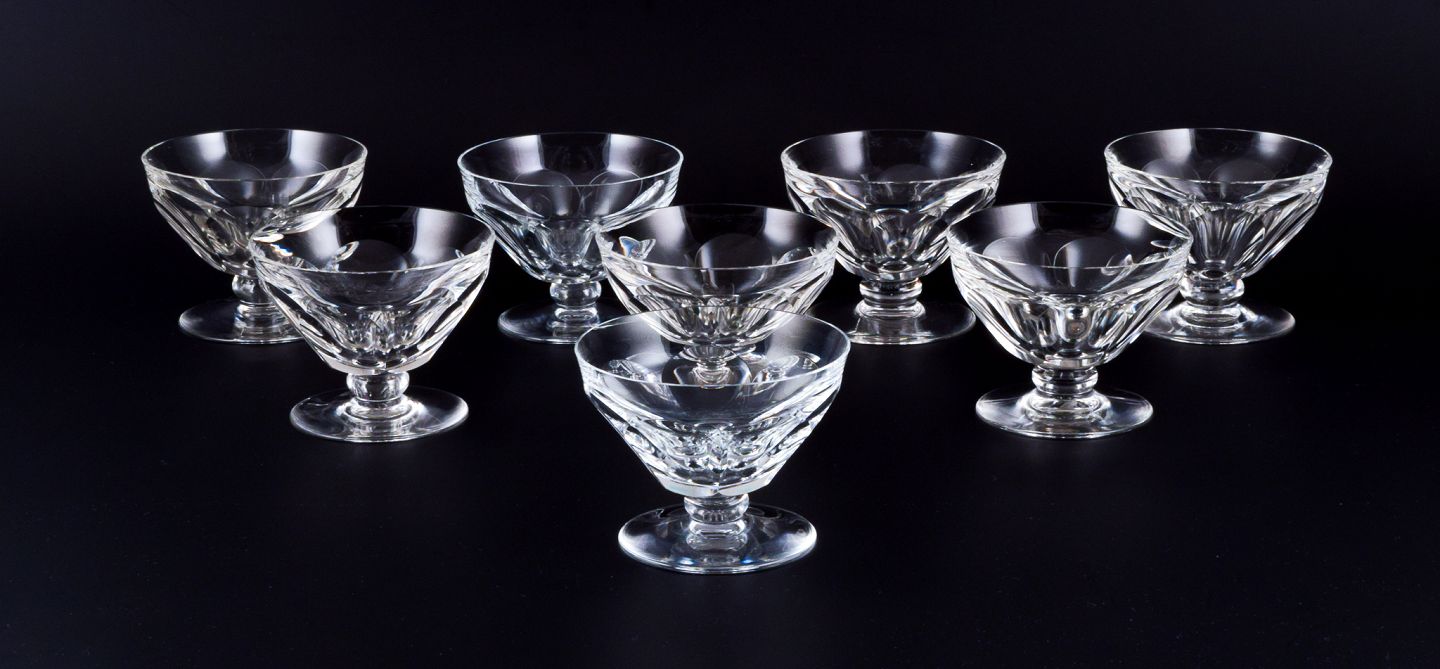 Baccarat, France. A set of eight Art Deco champagne coupes in faceted crystal glass.