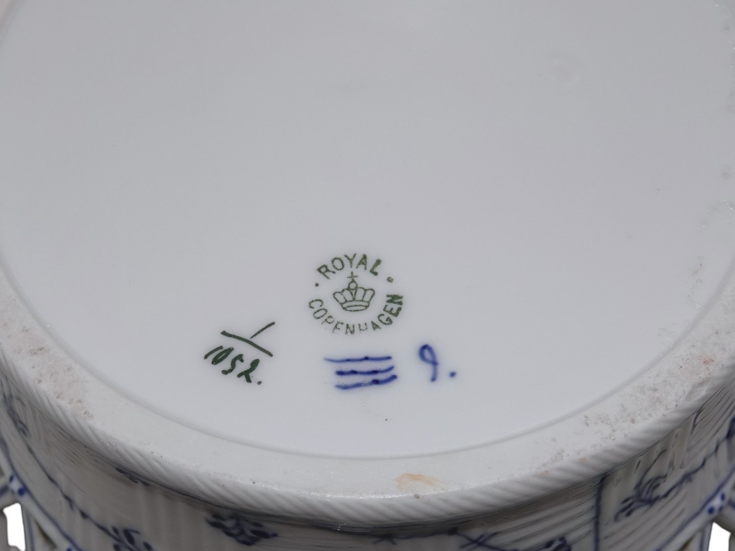 Royal Copenhagen Musselmalet Helblonde, rund frugtskål med hanke.