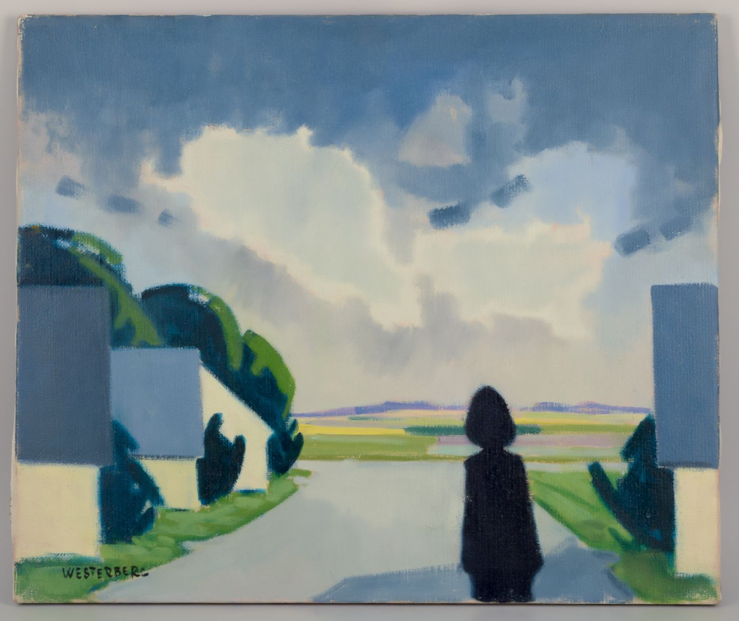 Oil on canvas. Modernist style. Landscape with figure.