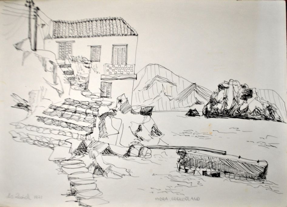 Zwick, Lis (1942- 2020) Denmark/Sweden: Hydra, Greece. Marker on paper. Signed: Lis Zwick 1971. 42 x 60 cm.