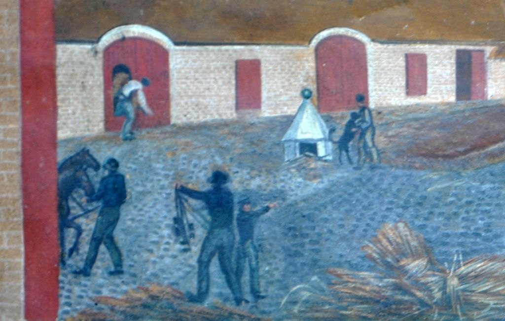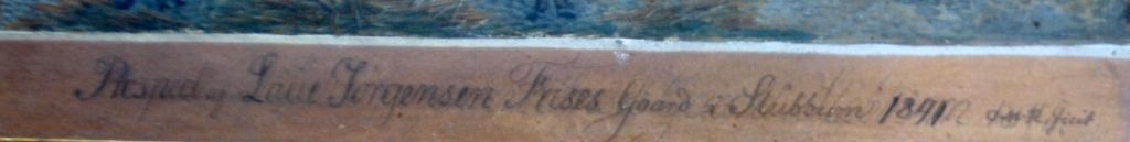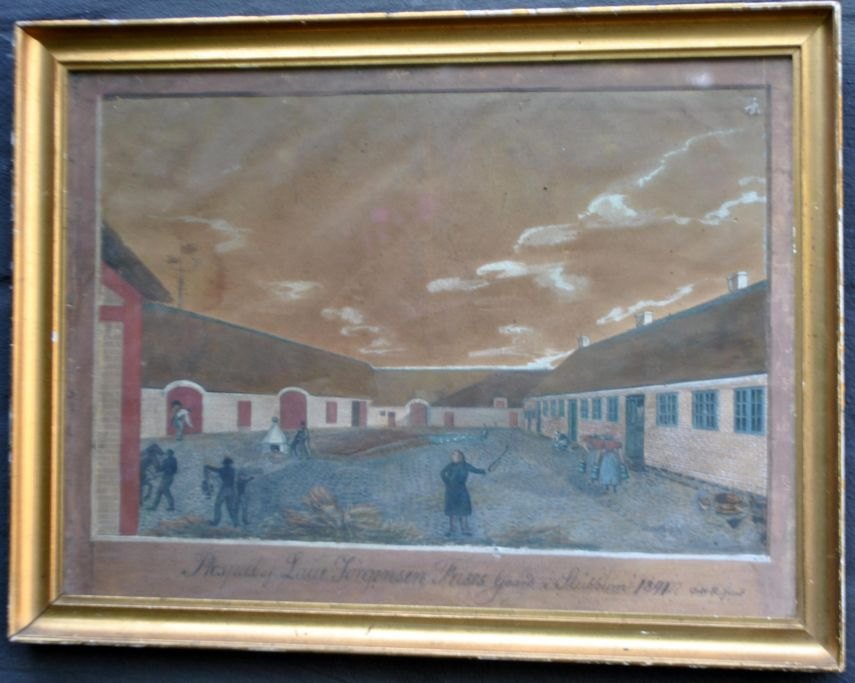 Dansk kunstner (19. årh.): Prospekt af Laue Jørgensen Frises Gaard i Stubbum. 1841. Pastel på papir. Signeret: O.M.R. 1841. 26 x 38 cm.  Indrammet: 32 x 42 cm. Enestående kilde til lokalhistorien. Landsbyen Stubbum ligger lidt vest for Christianfeld i Sønderjylland.  Gårdejer Laue Jørgensen Friis blev født den 2.sep. 1791 i Aller, Haderslev Amt. Han indgik ægteskab med Bodil Kirstine Lorentsdatter, den 23. august 1817 i Aller. (MyHeritage).