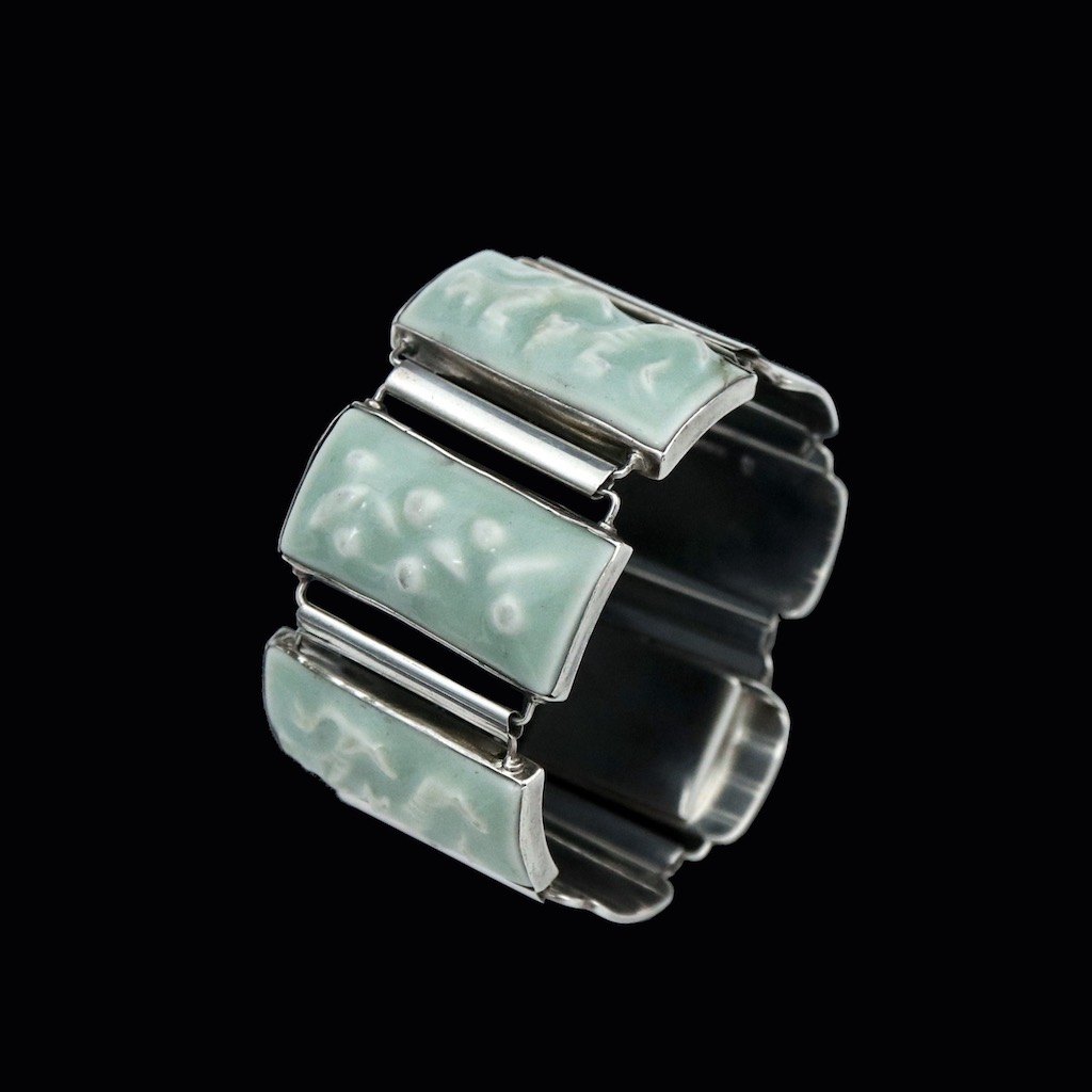 Jais Nielsen 1885-1961. Armbånd i sterling sølv med keramik med celadon glasur.