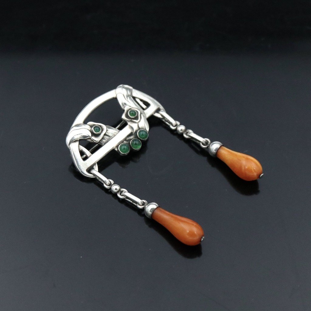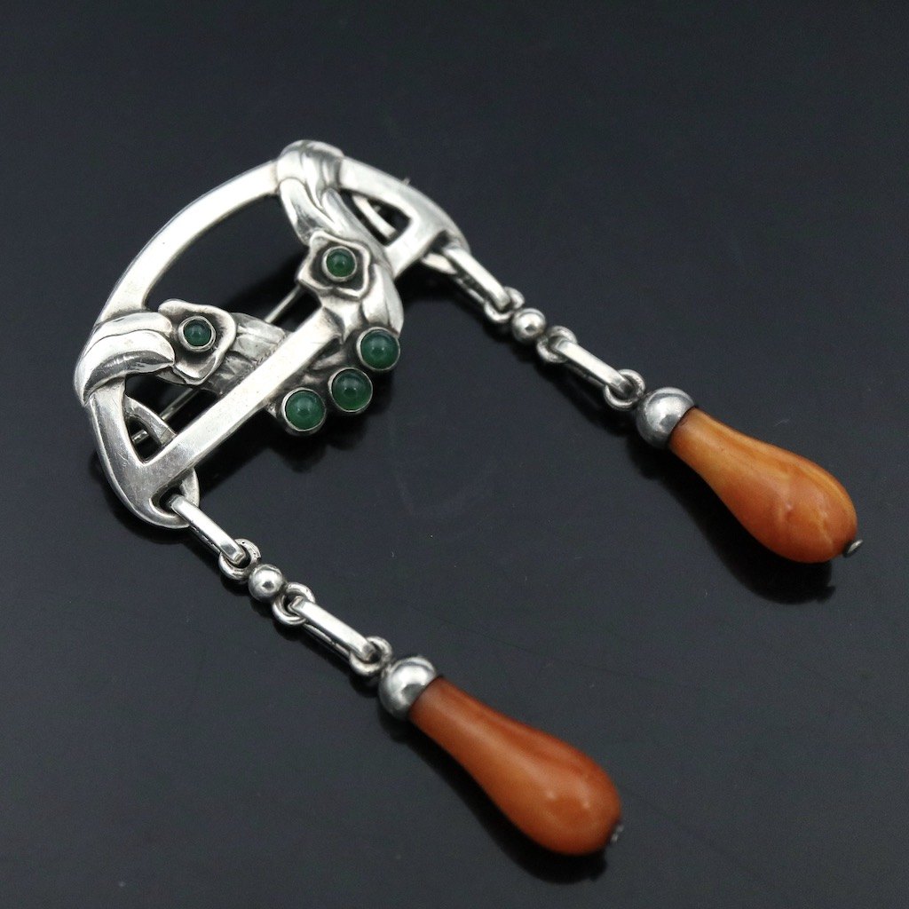 Georg Jensen. 826s Silver Brooch with Agates and Amber. 1907-14 Hallmarks.