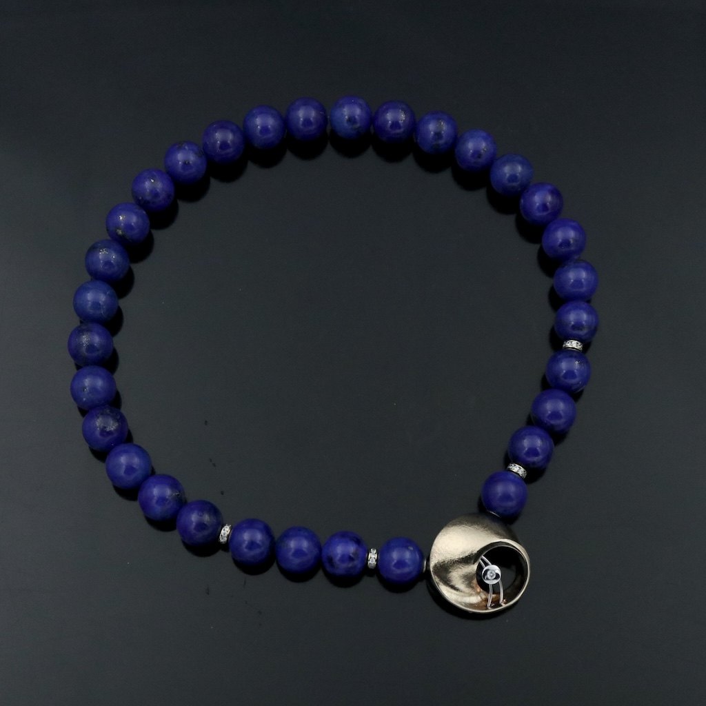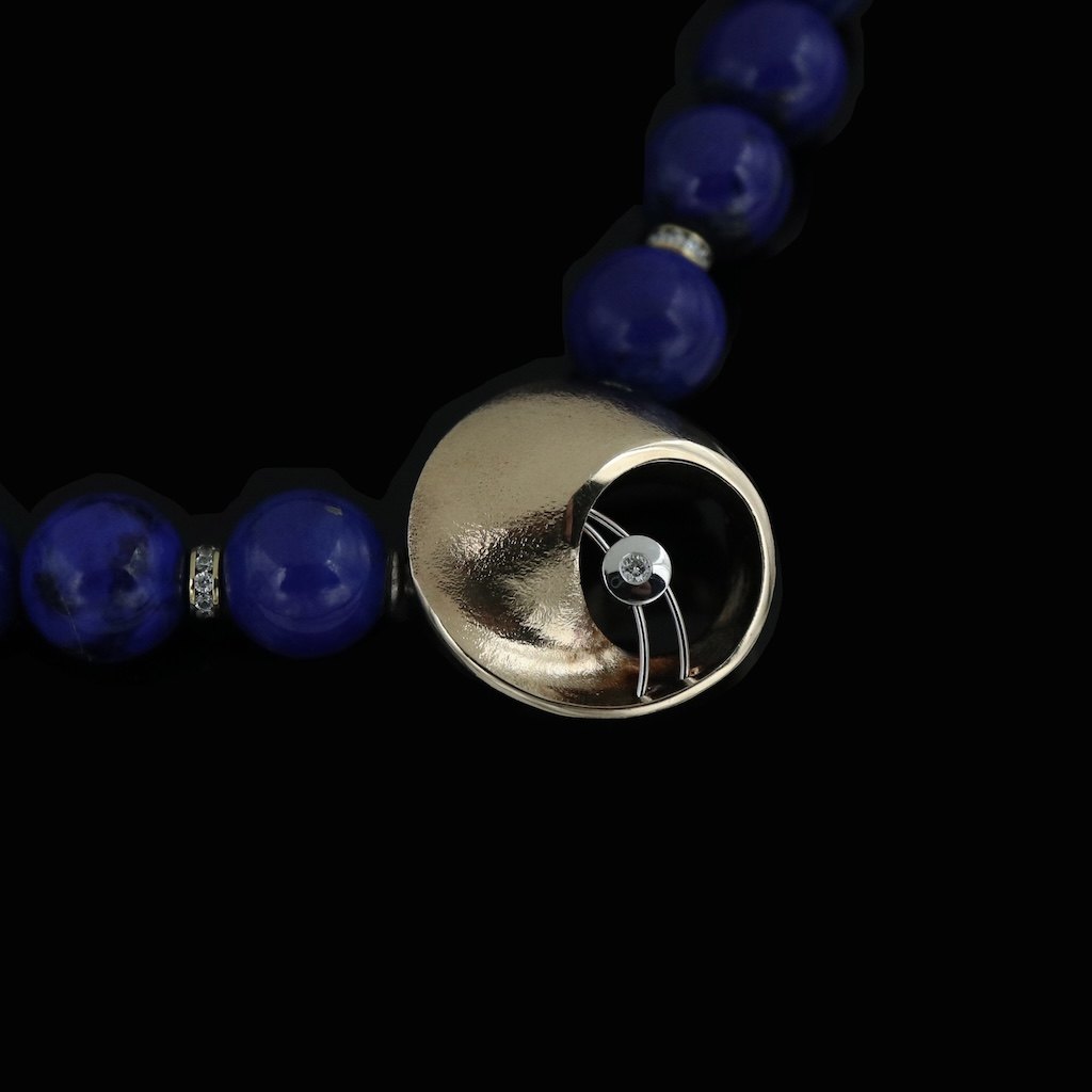 | Lapis Lazuli Bead Necklace with Sterling Silver & 14k Gold Diamond Clasp. 1,2 cm. Lapis Beads Necklace with four 14k gold and diamond rings.