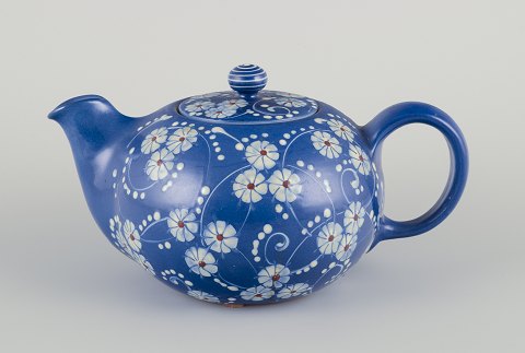 Stor ”Marguerite” tekande med blå glasur, dekoreret med hvide blomster.