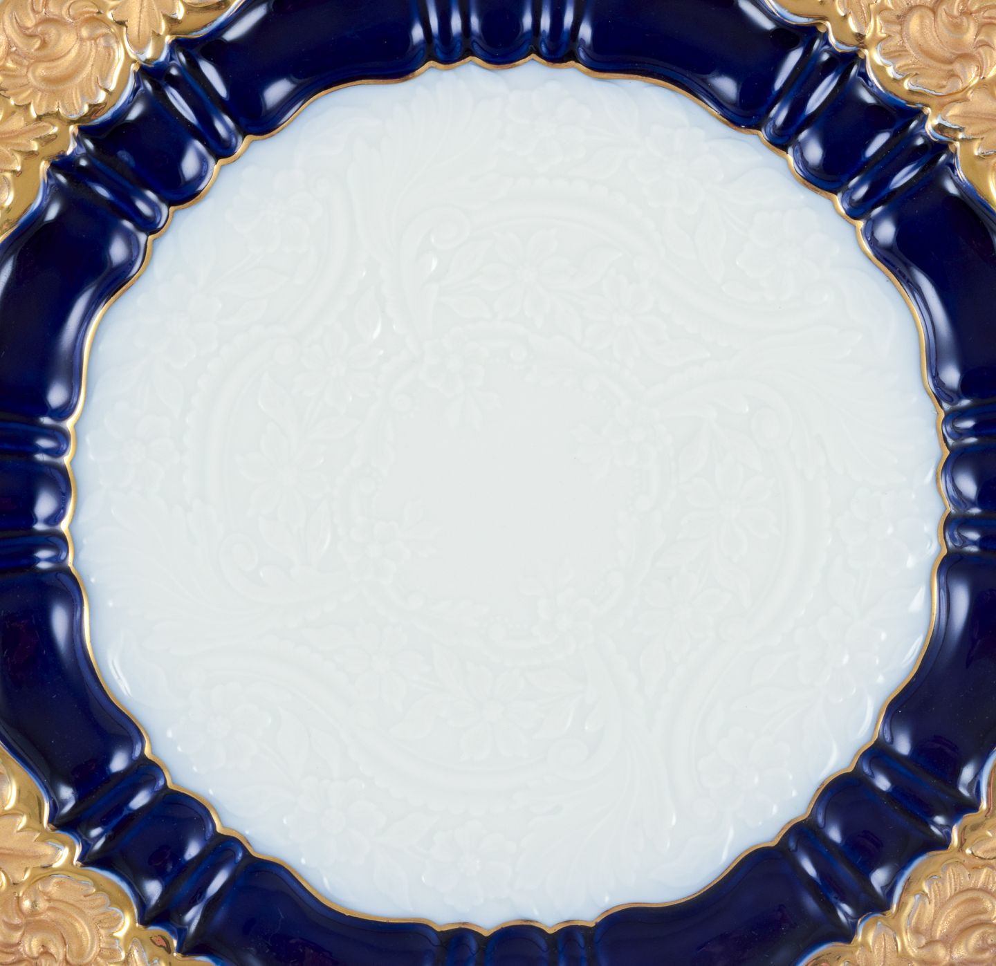Meissen, Tyskland. Prydfad af porcelæn, dekoreret i koboltblå glasur og guld med blomstermotiv i relief, svungen kant med bladværk.
