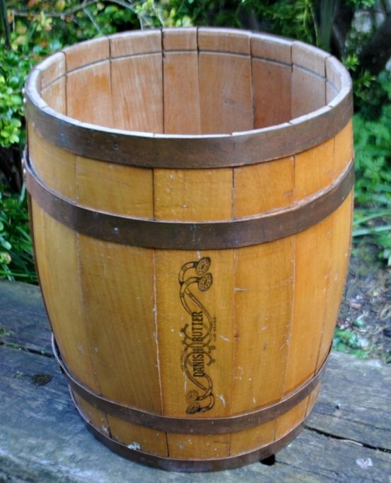 Gammel miniature smør drittel, 20. årh. Danmark. Udført med træstave, poleret bøgetræ. Ringe i form af kobber. På to af stavene er der stempel for Danish Lurpak. H. 34,5 cm. Dia.: 24 cm.