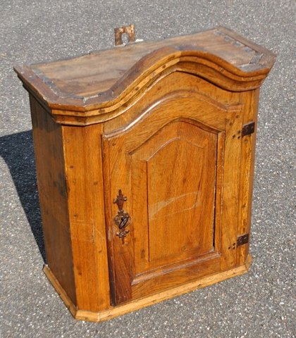 Dansk barokt hængeskab i poleret egetræ, 18. årh. Med låge med låg og nøgle. Indvendig med to hylder og to skuffer. H.: 70 cm. B: 60 cm. D.: 31 cm.