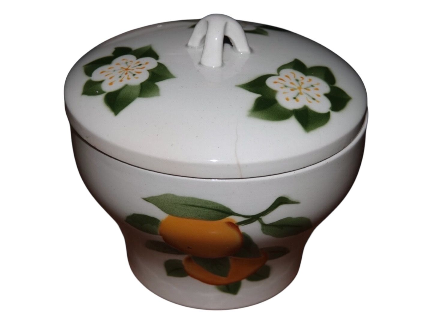 Der er en hårrevne samt et skår på indersiden af låget, se fotos ellers fejlfri stand.