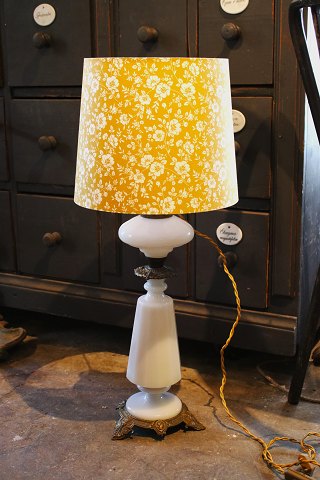 Antique, 19th century table lamp in white opal glass with bronze fittings.