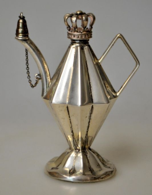 Hugo Grün lille olie lampe i sølv, 20. årh. København, Danmark. Stemplet: 835S H.Gr. Med låg i from af kongekrone. Med hank og tud. På udfyldt fod. H. 9 cm.