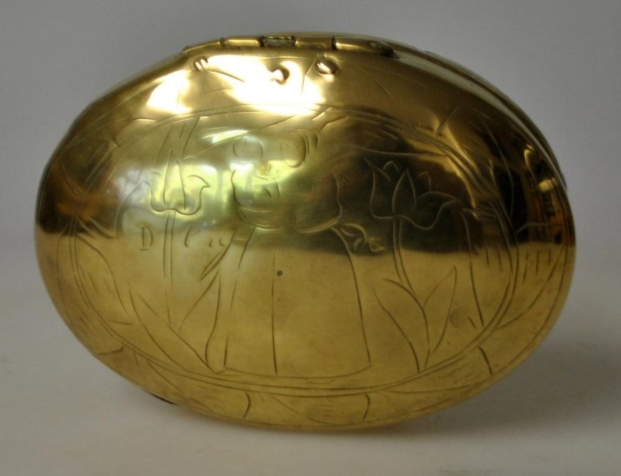 Hollandsk tobaksæske i messing, 1749. Med dekorationer i form af to kvinder og landskab med kirke. Oval med låg. Repareret. Med ejerinitialer og årstal.: 1749. L.: 11 cm.