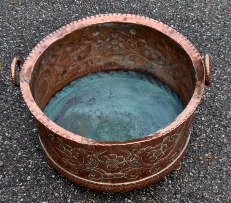 Brændespand, Haraldskjær Kobber Fabrik, Vejle, 19. årh. Danmark. Med tre ben og to hanke. Med tarige bankede dekorationer på siden. H.: 29 cm. Dia.: 40 cm.  Perfekt stand!