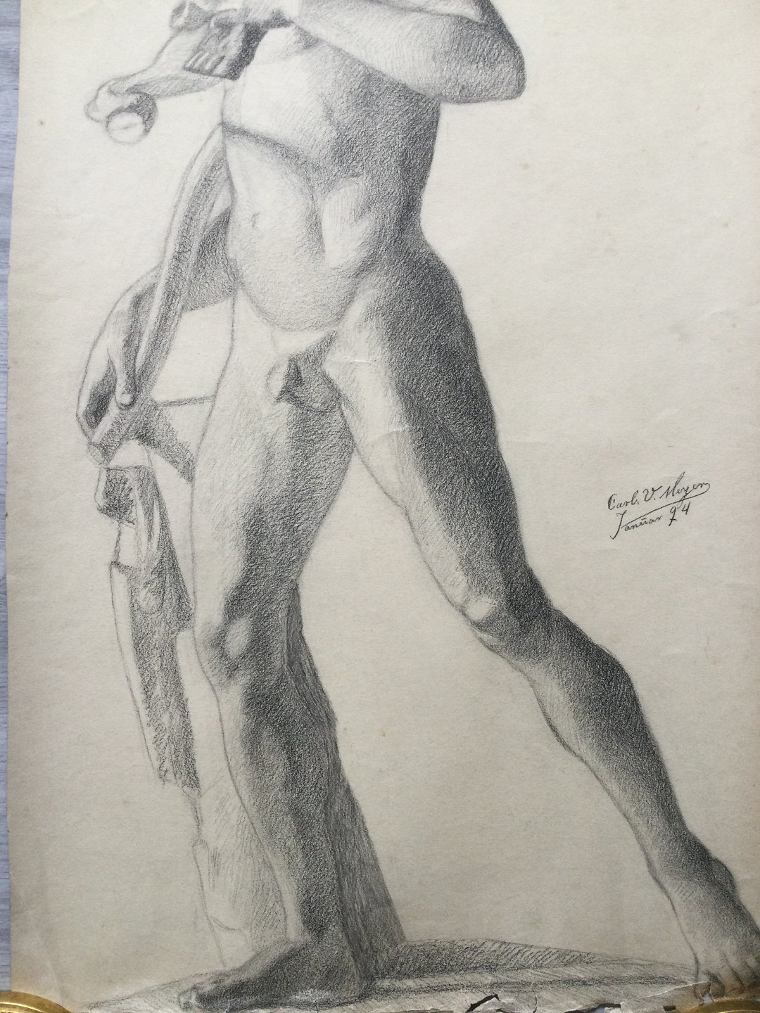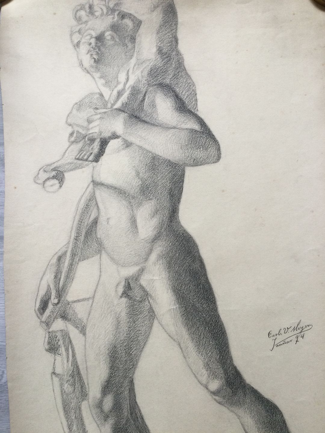 Akademitegning af Carl V. Meyer - Nøgen mand - Jæger med bytte 1894.