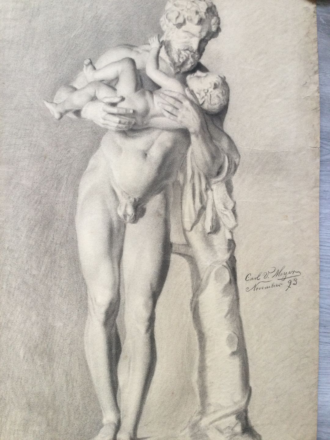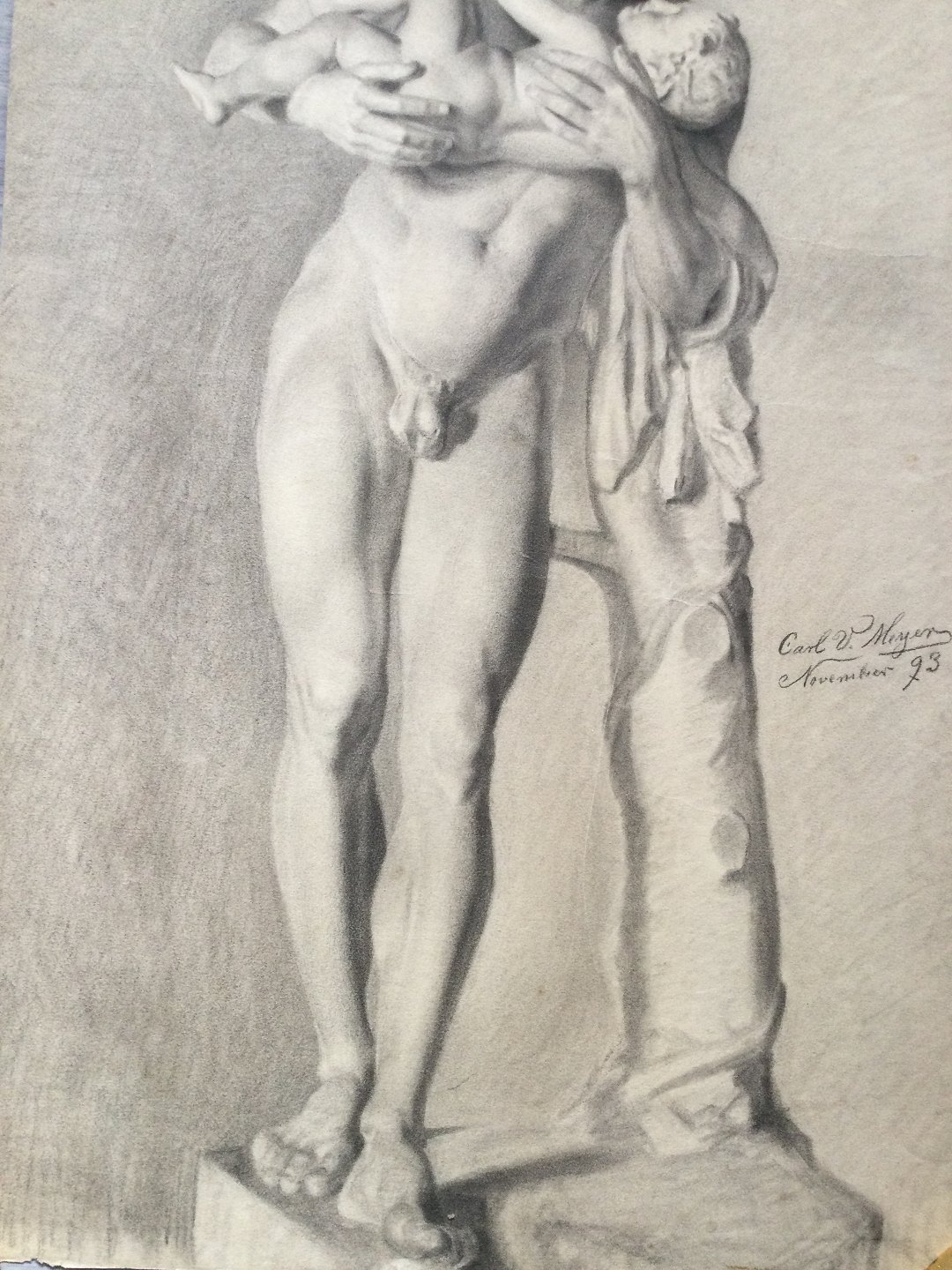 Akademitegning af Carl V. Meyer 1893 - Nøgen mand med barn - Marmorskulptur - Silenus med Dionysus.