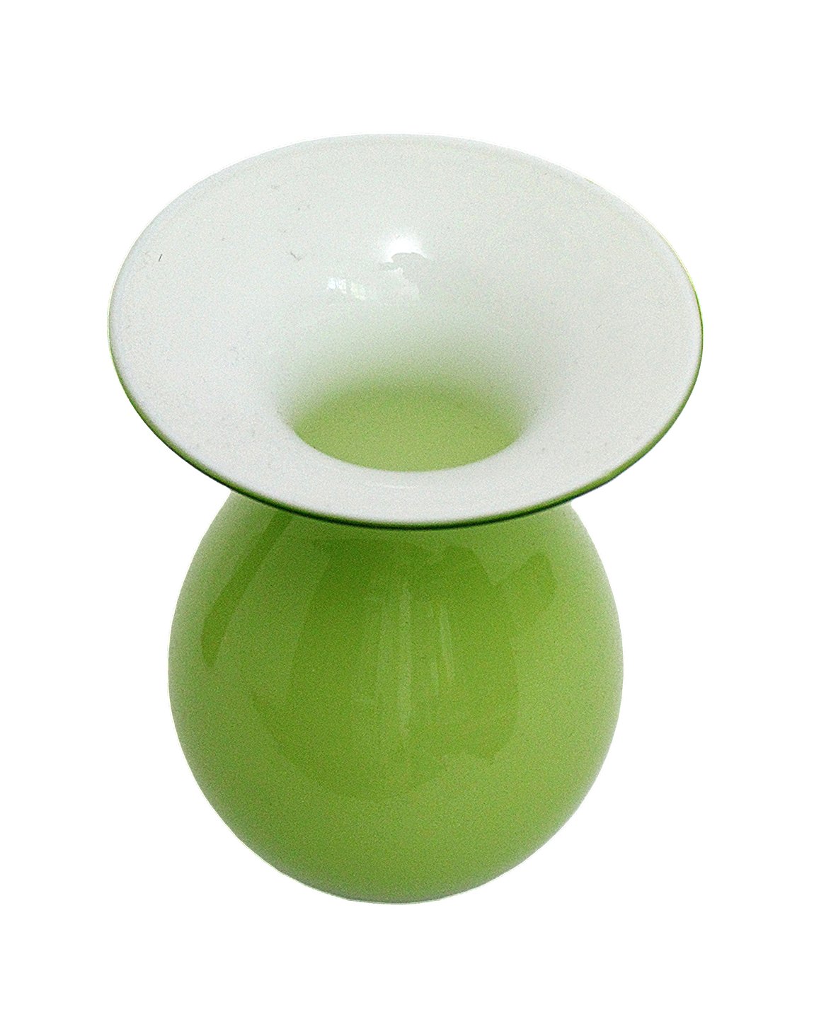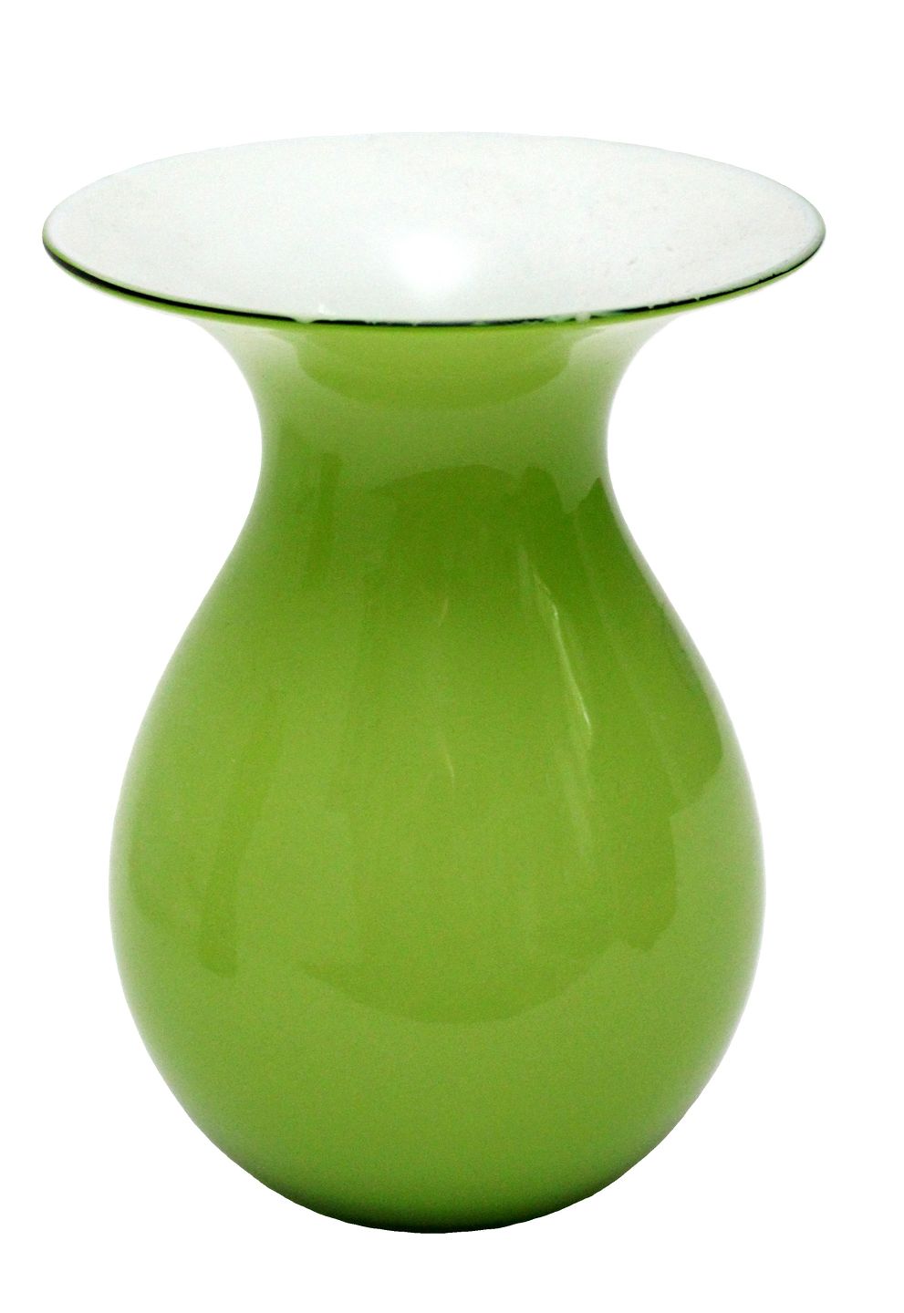 Holmegaard, Shape, Grøn vase opalhvid indvendig, mundblæst glas. Designet af Peter Svarrer 2005. Højde 17 cm. Der er flere størrelser i Shape, dette er den mindste. I. sortering. Med en produktionsfejl i kanten af kraven mellem hvid og grøn, se foto. Pris: 375 kr.