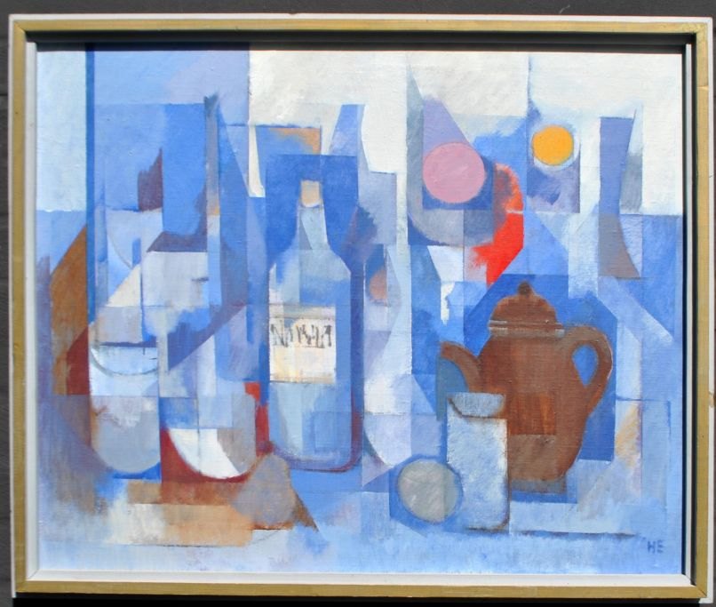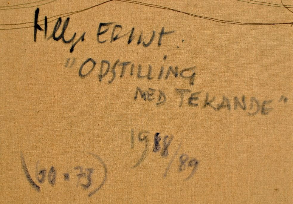 Ernst, Helge (1916 - 1991) Danmark: Opstilling med tekande. Olie på lærred. Signeret. 60 x 73 cm.  Indrammet: 66 x 78 cm.  Verso signeret: Helge Ernst 1988/1989. Udstillet: Art Gallery, Aarhus.  NB: Der ydes ingen rabat på dette lot!
