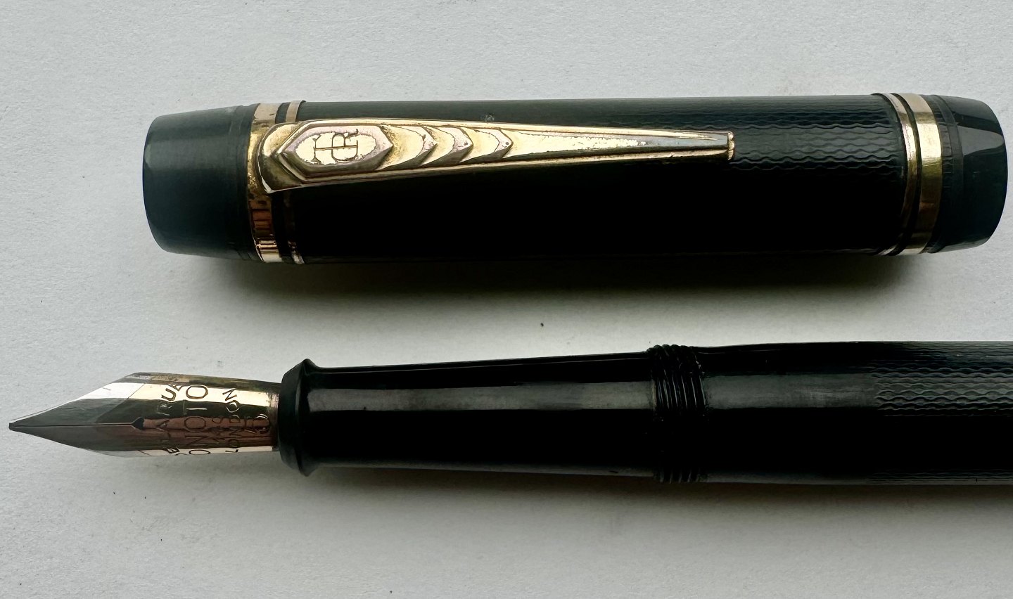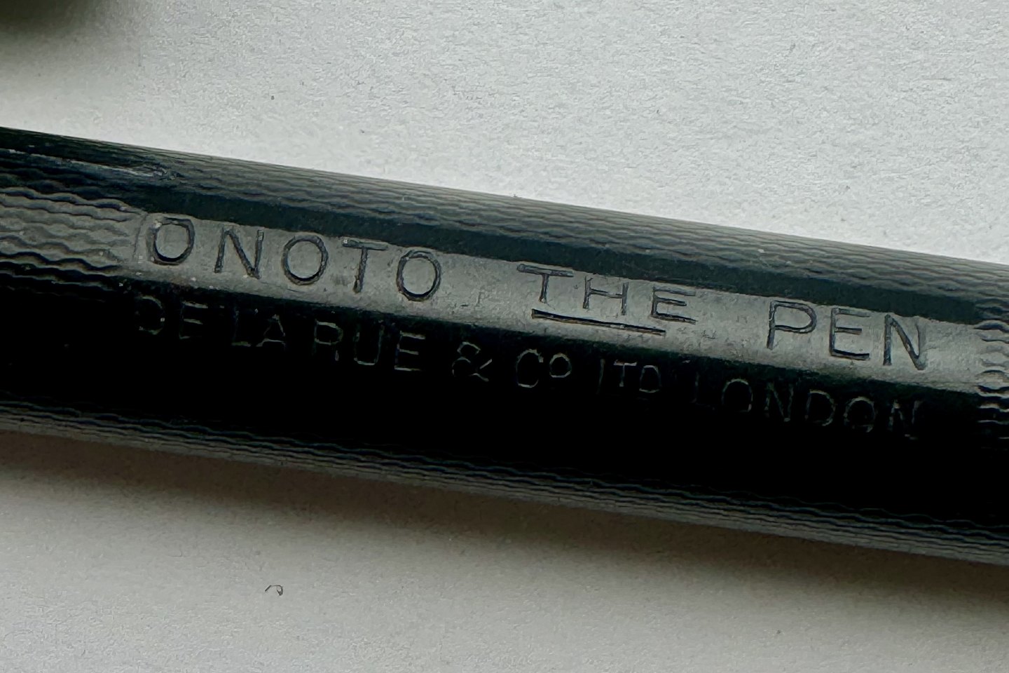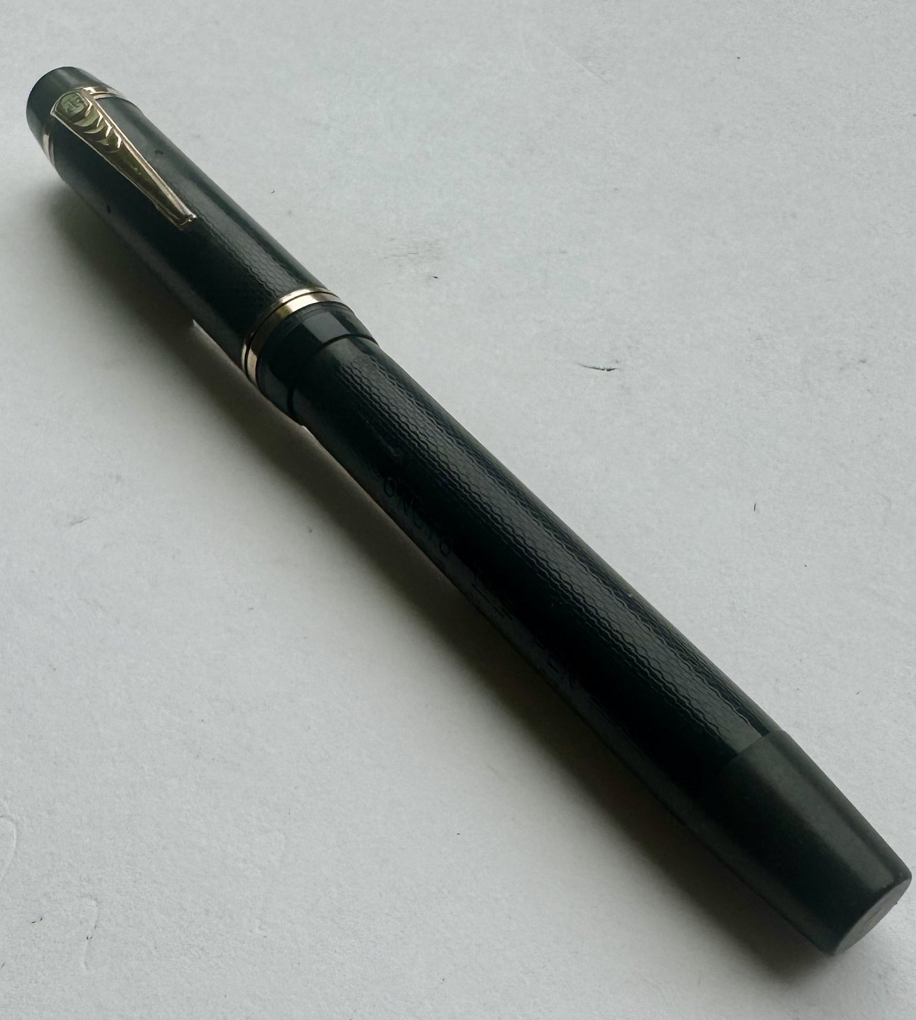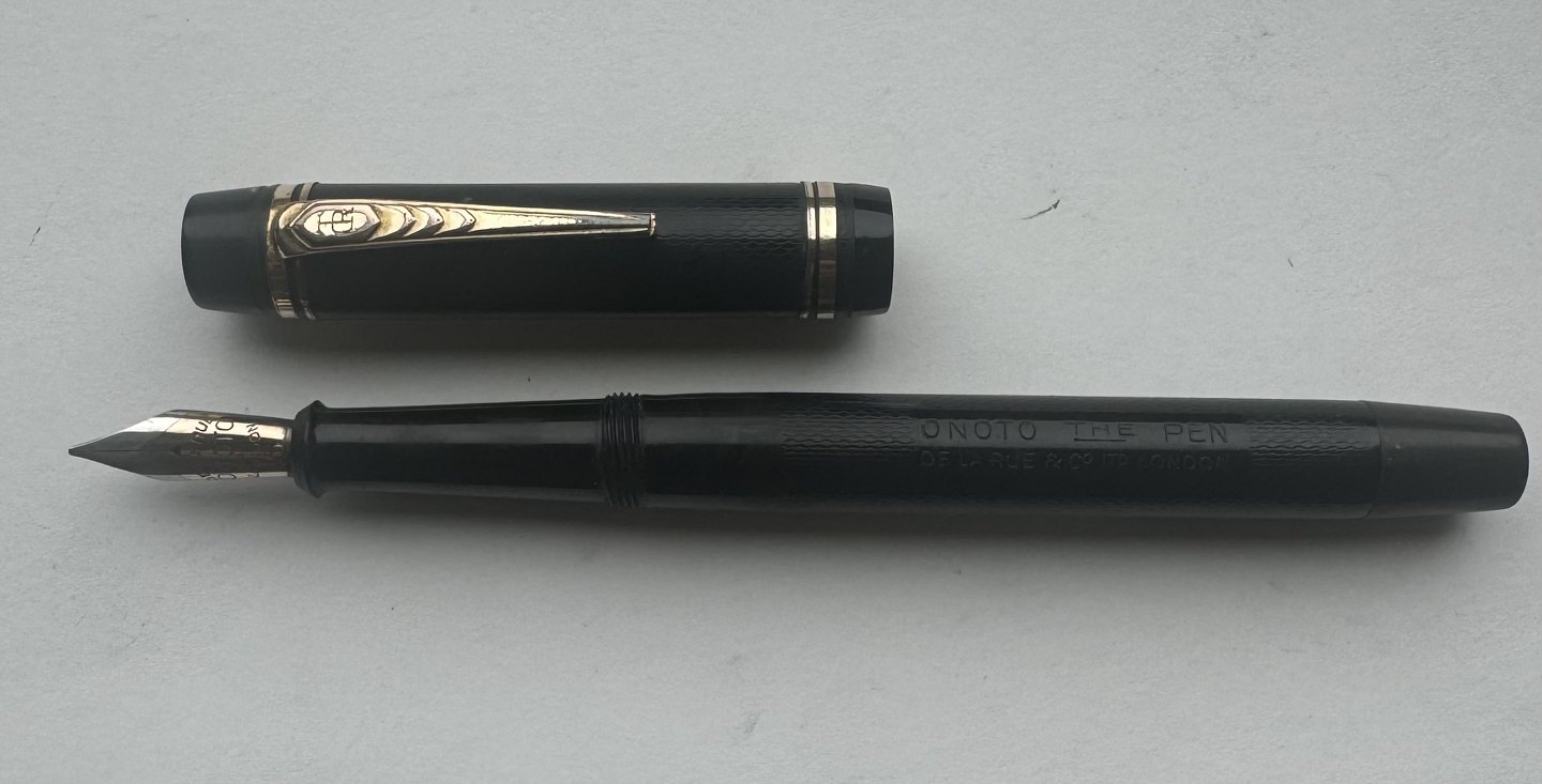 Sort Onoto “The Pen” fyldepen. Fremstår I god stand uden skader eller reparationer. Alle dele originale Onoto inclusiv en flot De la Rue Onoto 14 karat London nr. 5 guldspids. Der skal indsættes ny gummisæk før end den fungerer igen. Ny gummisæk kan indsættes for et tillæg på kr. 200,-