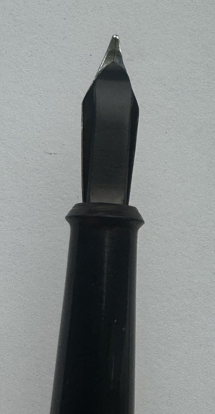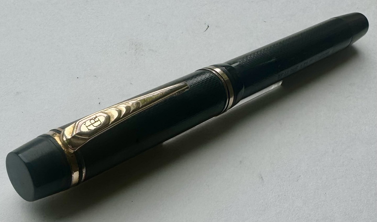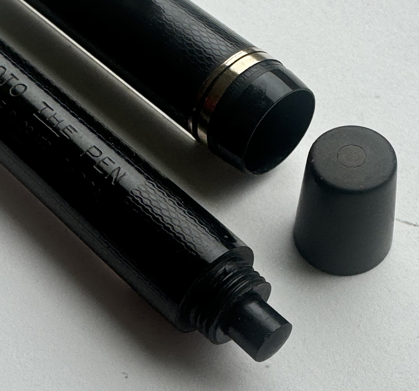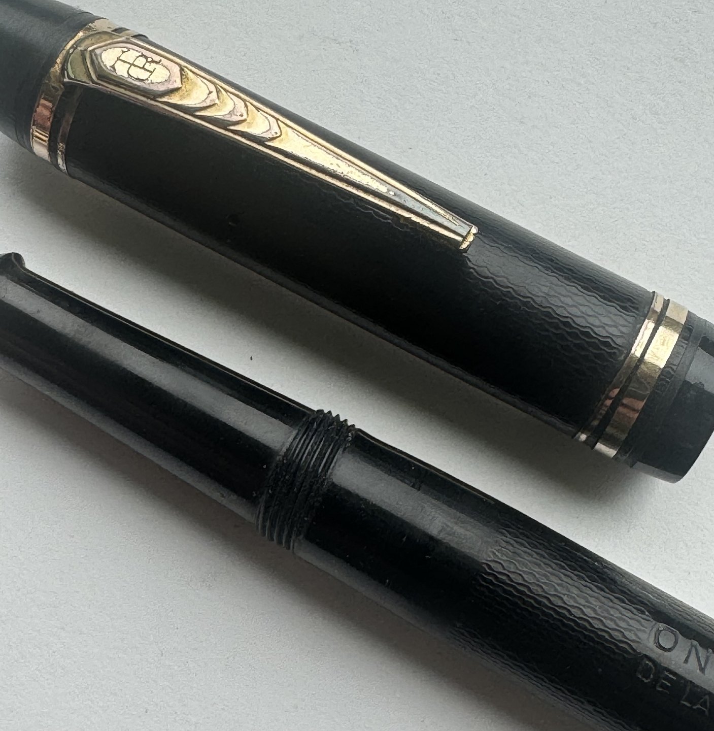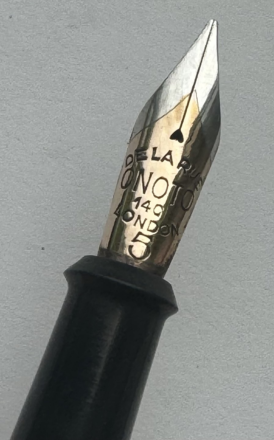 Sort Onoto “The Pen” fyldepen. Fremstår I god stand uden skader eller reparationer. Alle dele originale Onoto inclusiv en flot De la Rue Onoto 14 karat London nr. 5 guldspids. Der skal indsættes ny gummisæk før end den fungerer igen. Ny gummisæk kan indsættes for et tillæg på kr. 200,-