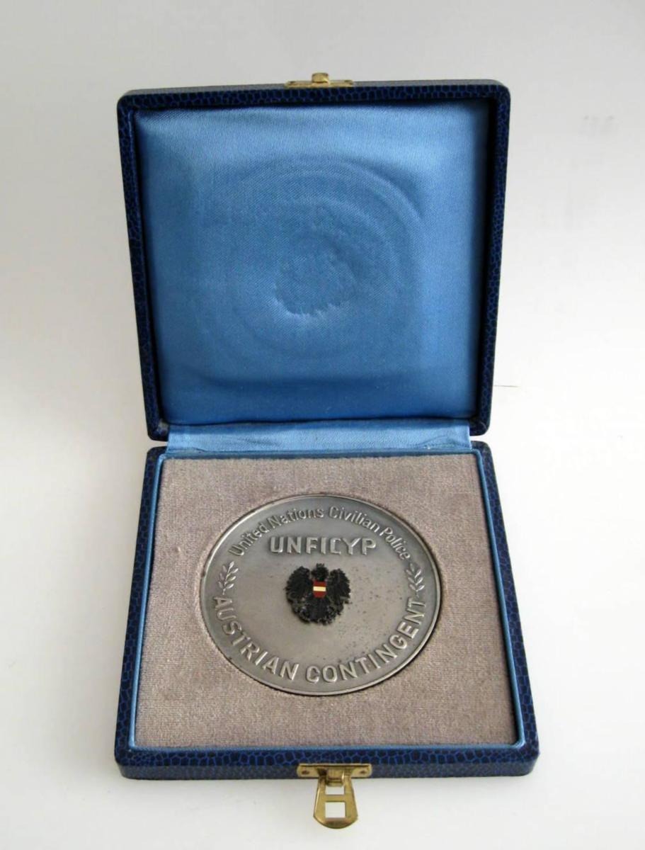 FN medalje - United Nations Civilian Police - Unficyp. Austrian Contingent. Dia.: 7,5 cm. Metal med emalje. Med inskription.: Lt. Col. P.E.P. Skov CO DANCON zur freundlichen Erinnerung, CYPRUS 1971. I orignial æske. Proveniens: Oberstløjtnant Poul Ervin O. Skov, Øverstkommanderende Dancon XIV, Cypern.