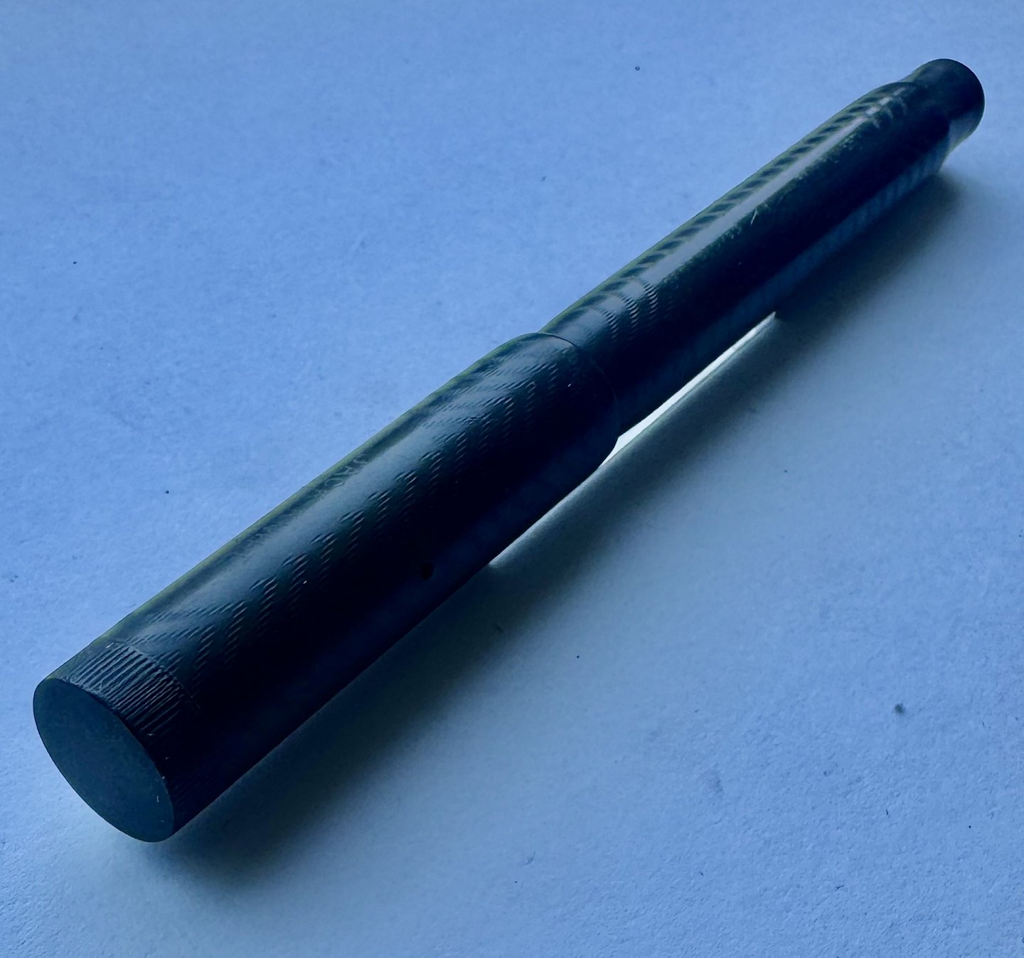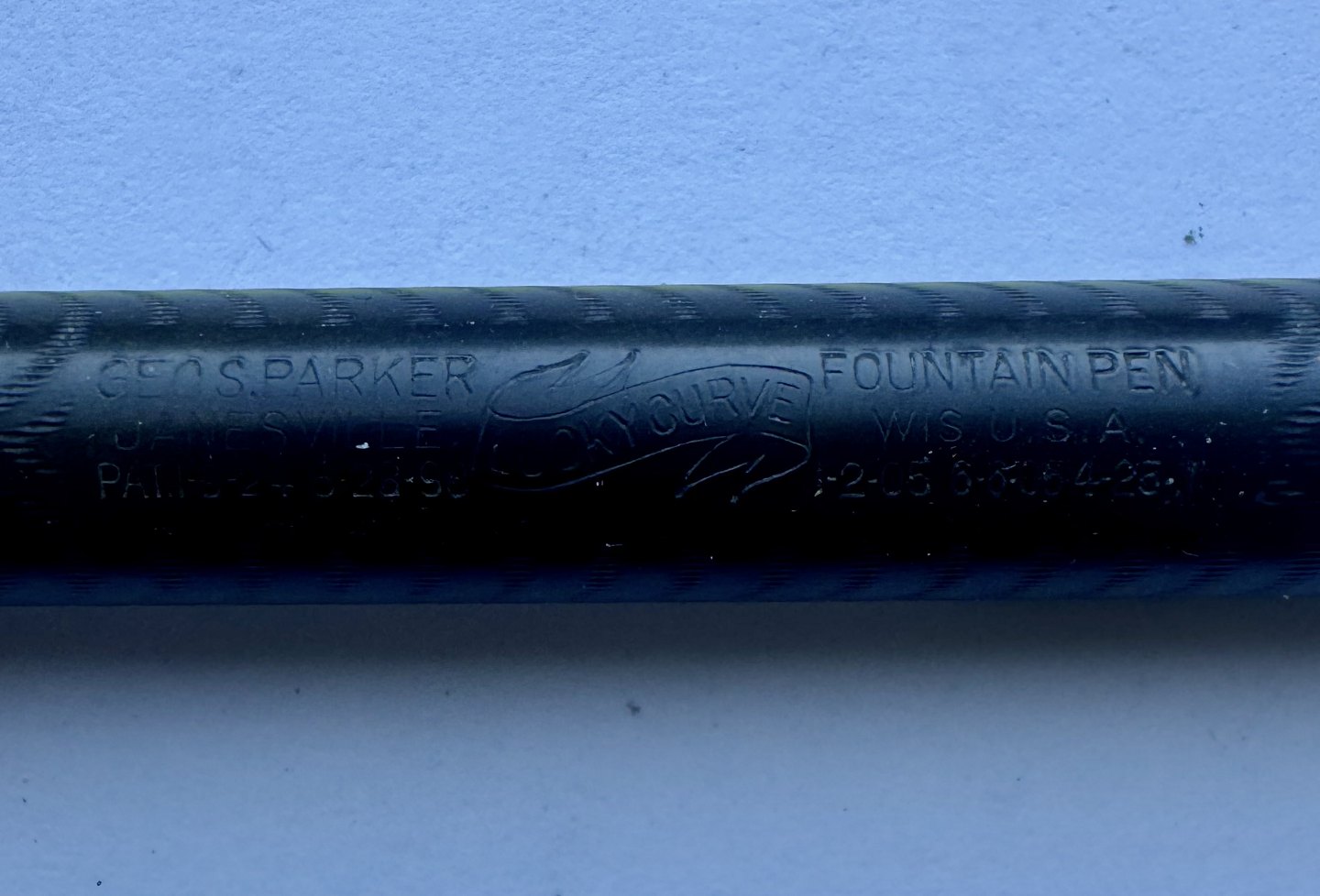 Sort Parker “Jack-Knife” Safety Lucky Curve fyldepen fra begyndelsen af 20. århundrede. Fungerer ikke. Der skal indsættes ny gummisæk før fyldepennen igen kan optage blæk og skrive igen. Fremstår i god stand. Dog mangler clip’en øverst på hætten. Fyldepennen er 13,5 cm lang.