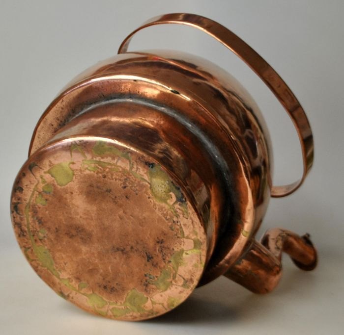 Kobber kedel med sæk, 19. årh. Med utydelige stempler. Med hank, låg og tud. H: 21 cm. H. inkl. hank: 29,5 cm. Dia: 20 cm.