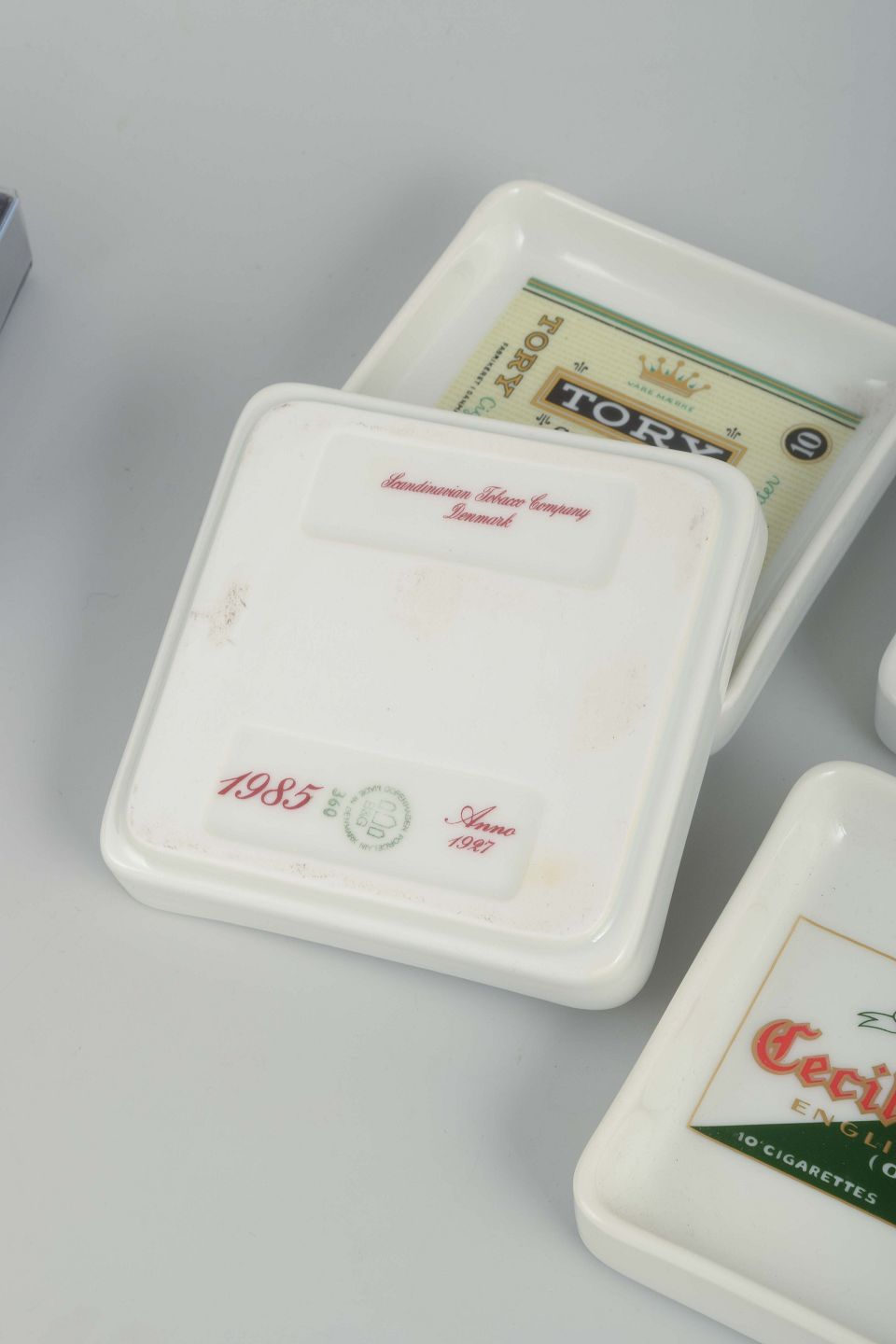 Bing & Grøndahl, grundlagt i København i 1853, er kendt for sit fine porcelæn og sine populære samlerobjekter. I 1980’erne producerede fabrikken også små serier af dekorative brugsgenstande, herunder askebægre med reklame- og tobaksdekorationer. Disse fire eksemplarer afspejler både porcelænskunstens kvalitet og tidens grafiske udtryk. Efter fusionen med Den Kongelige Porcelænsfabrik i 1987 blev Bing & Grøndahl en del af Royal Copenhagen, hvilket gør sådanne genstande til særligt interessante samlerobjekter i dag.