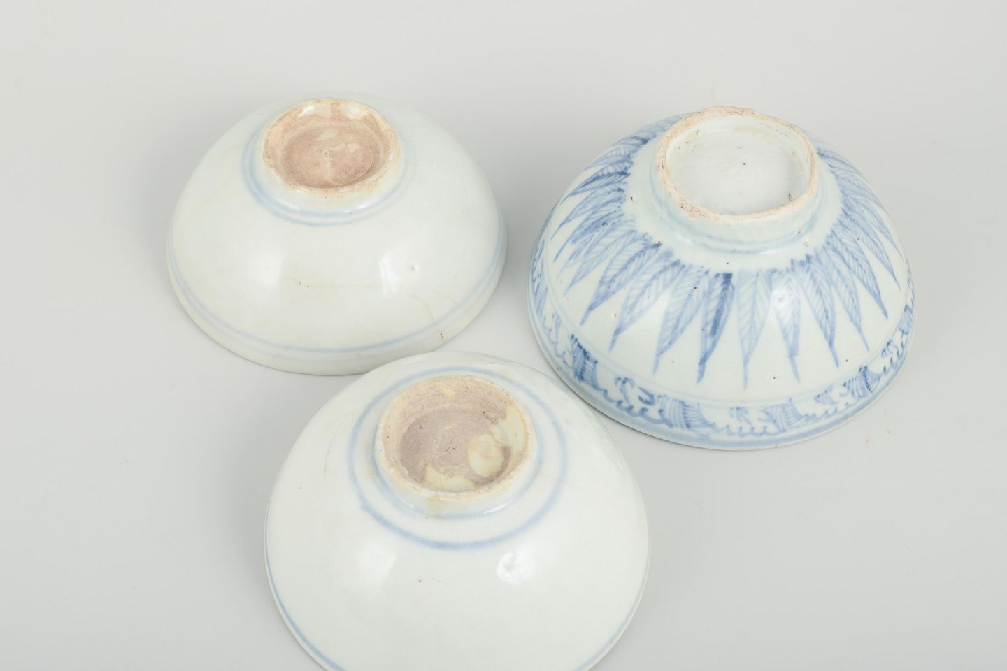 Tre drejede porcelænsskåle med underglasur dekoration i blå toner. To dekoreret indvendigt med blomster- og bladmotiver, den tredje med enkle koncentriske cirkler.