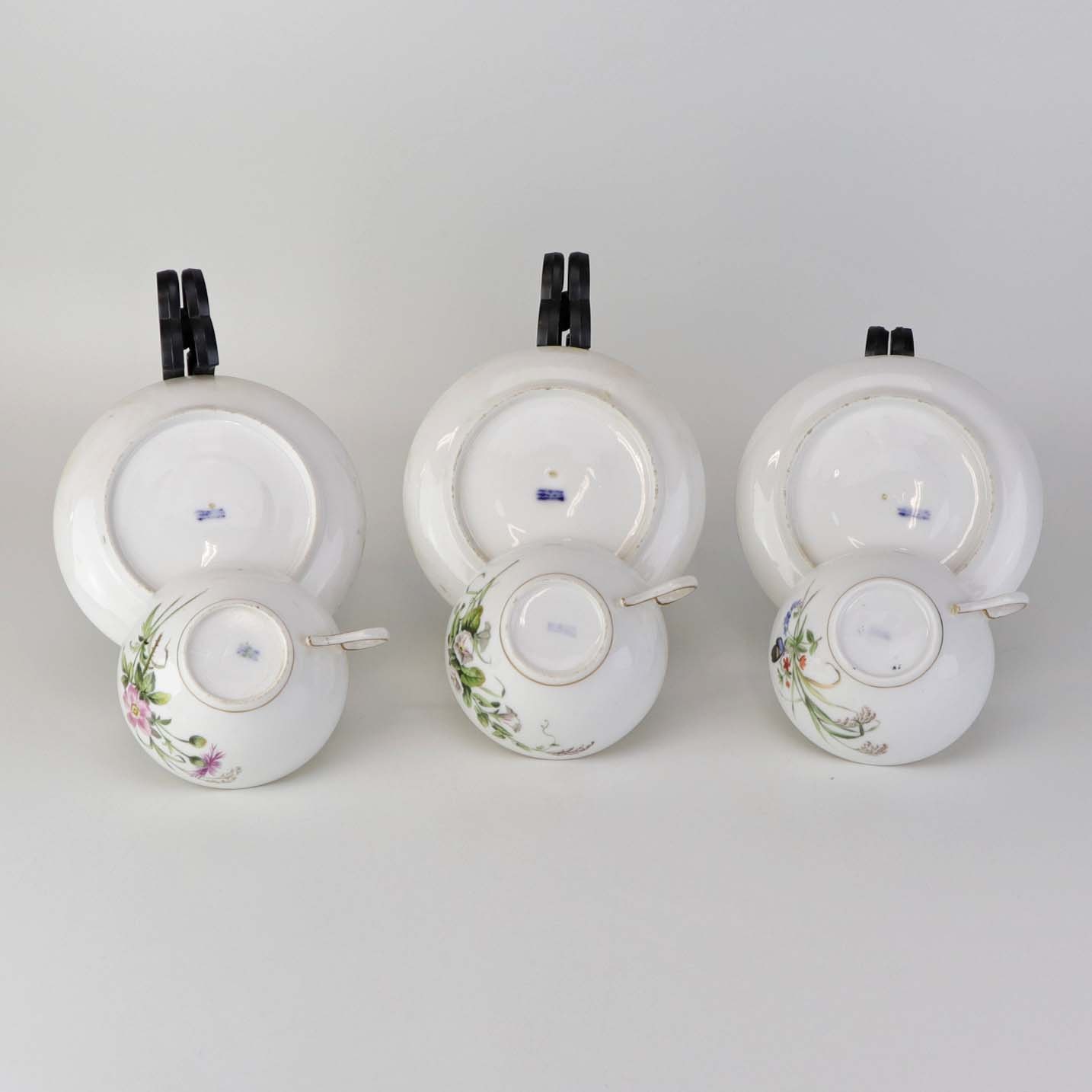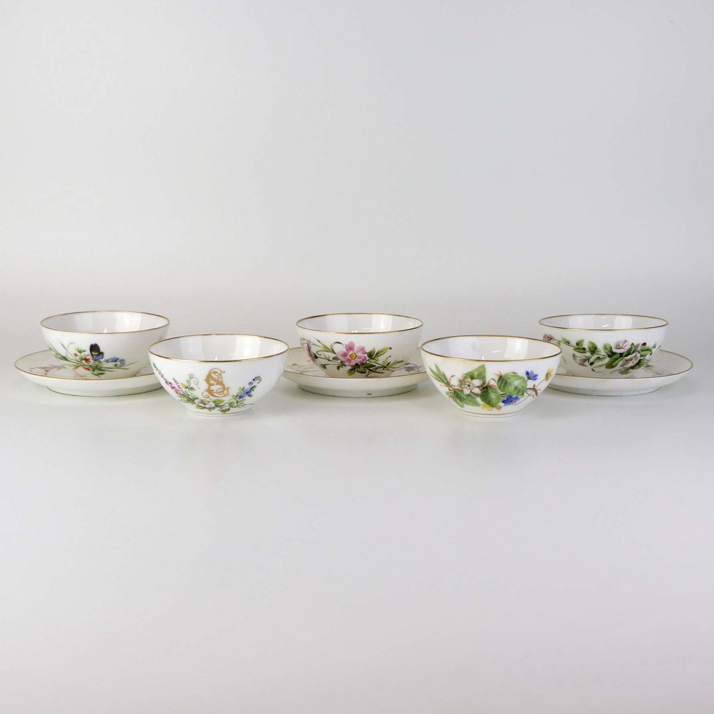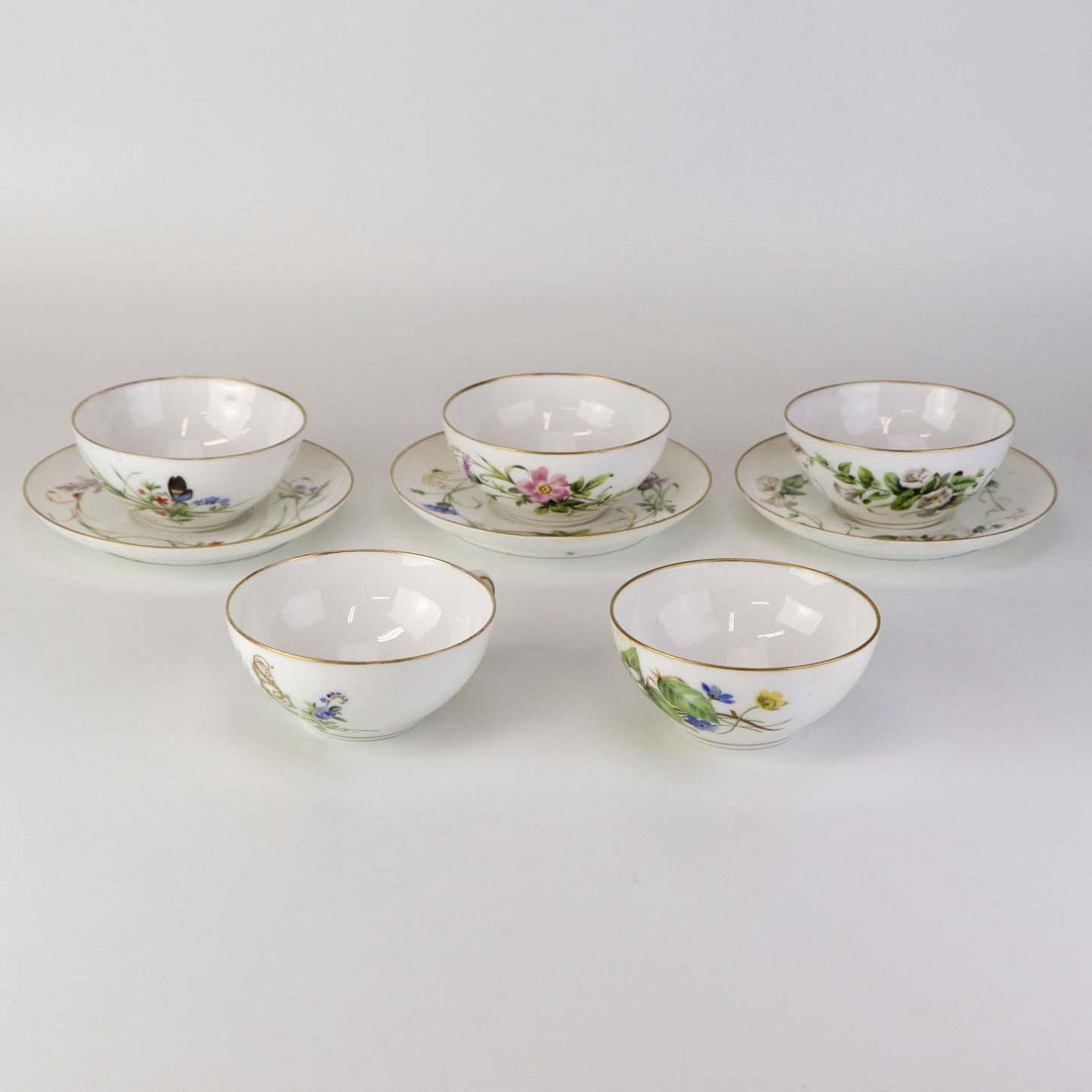 Sæt med fem styk kaffekopper og tre styk underkopper i porcelæn med håndmalede blomstermotiver og guldkant. Stellet fra ca 1850.
