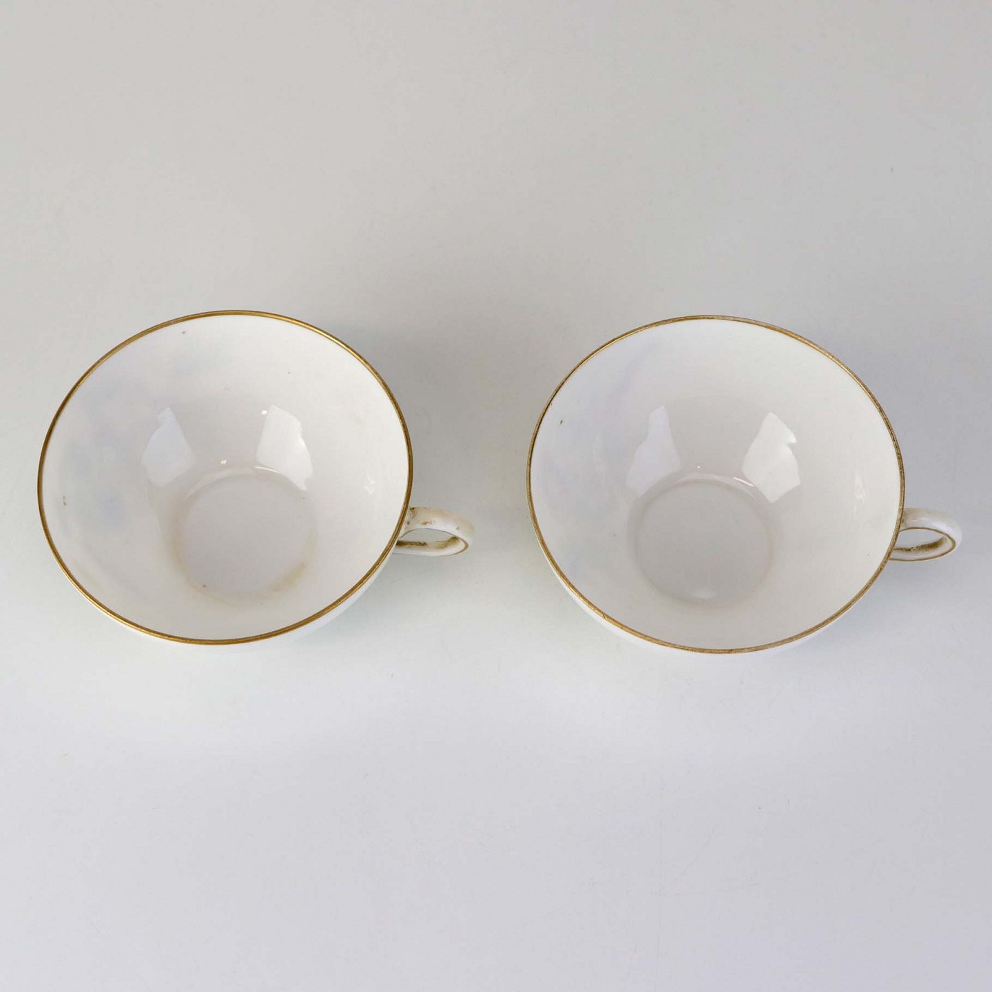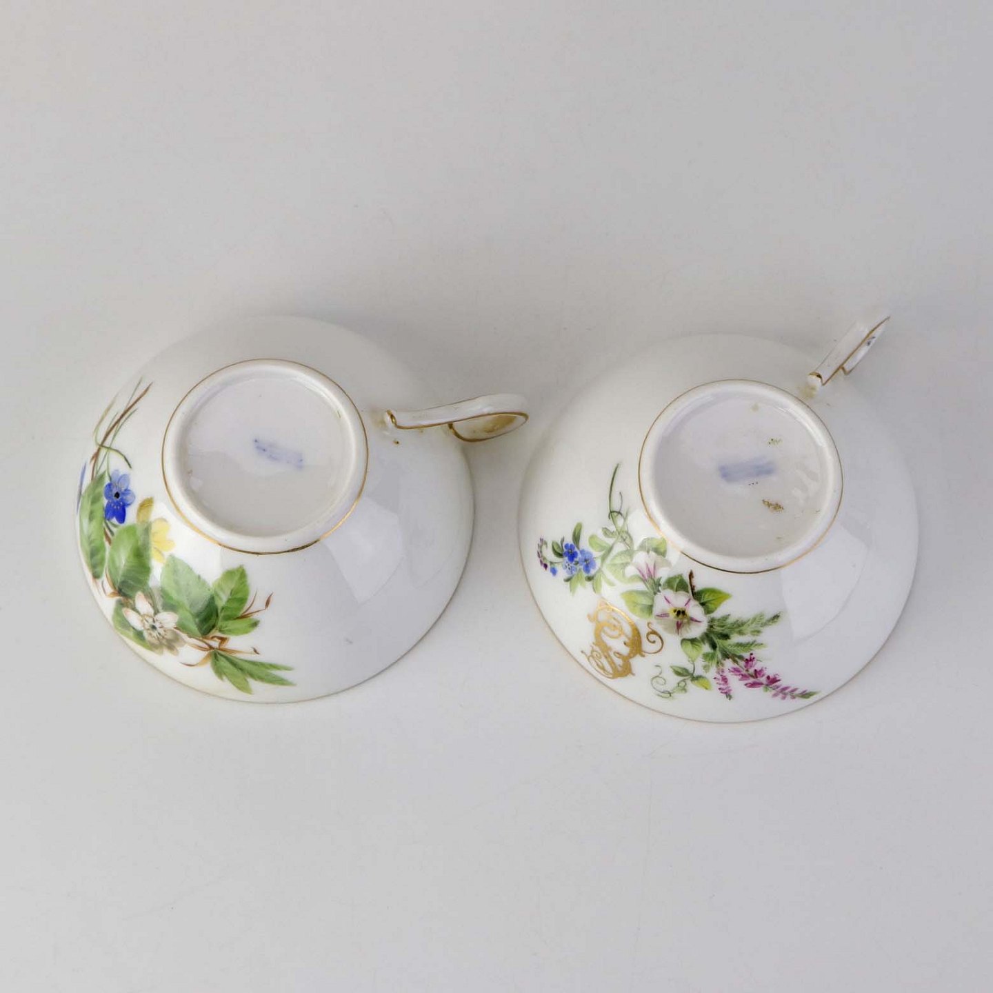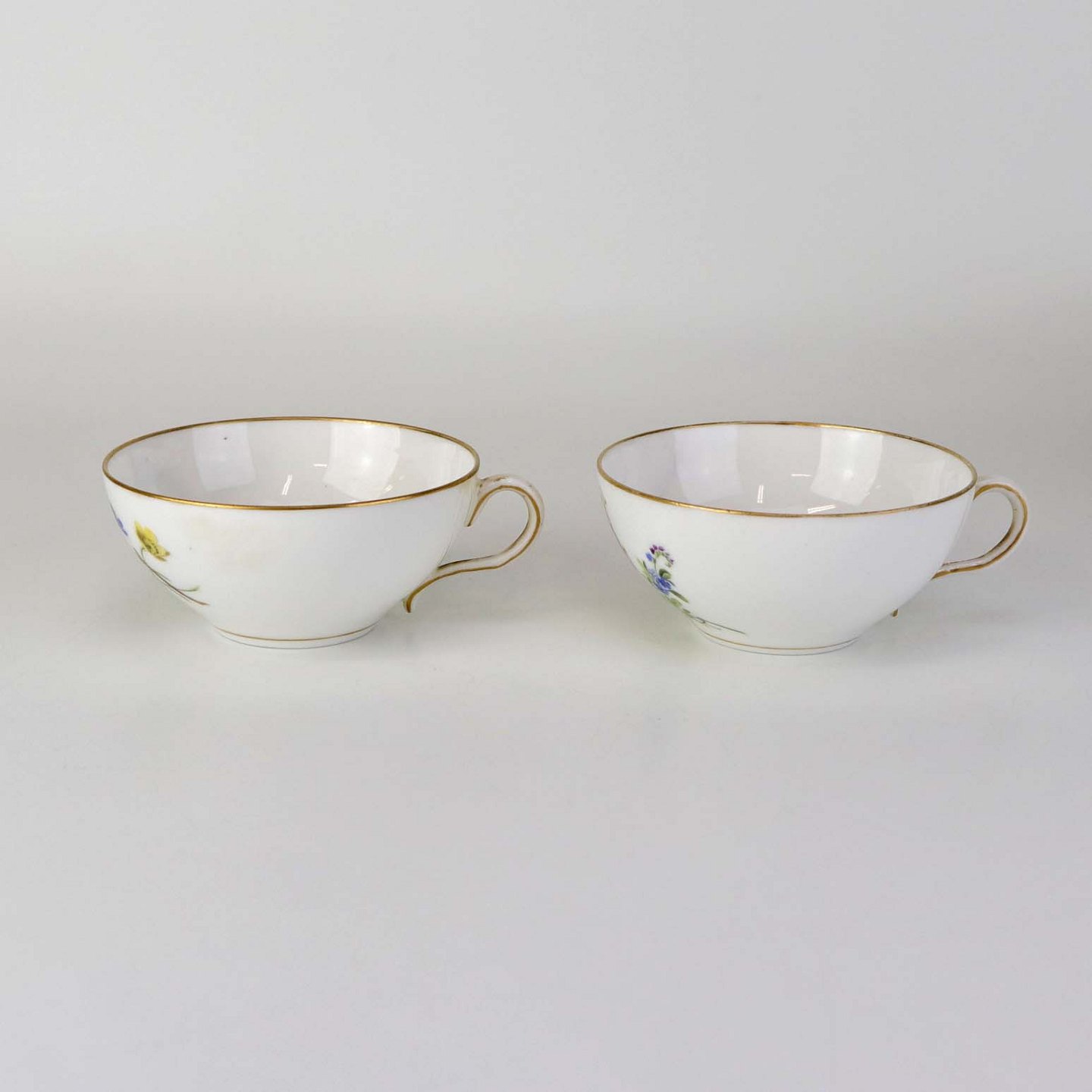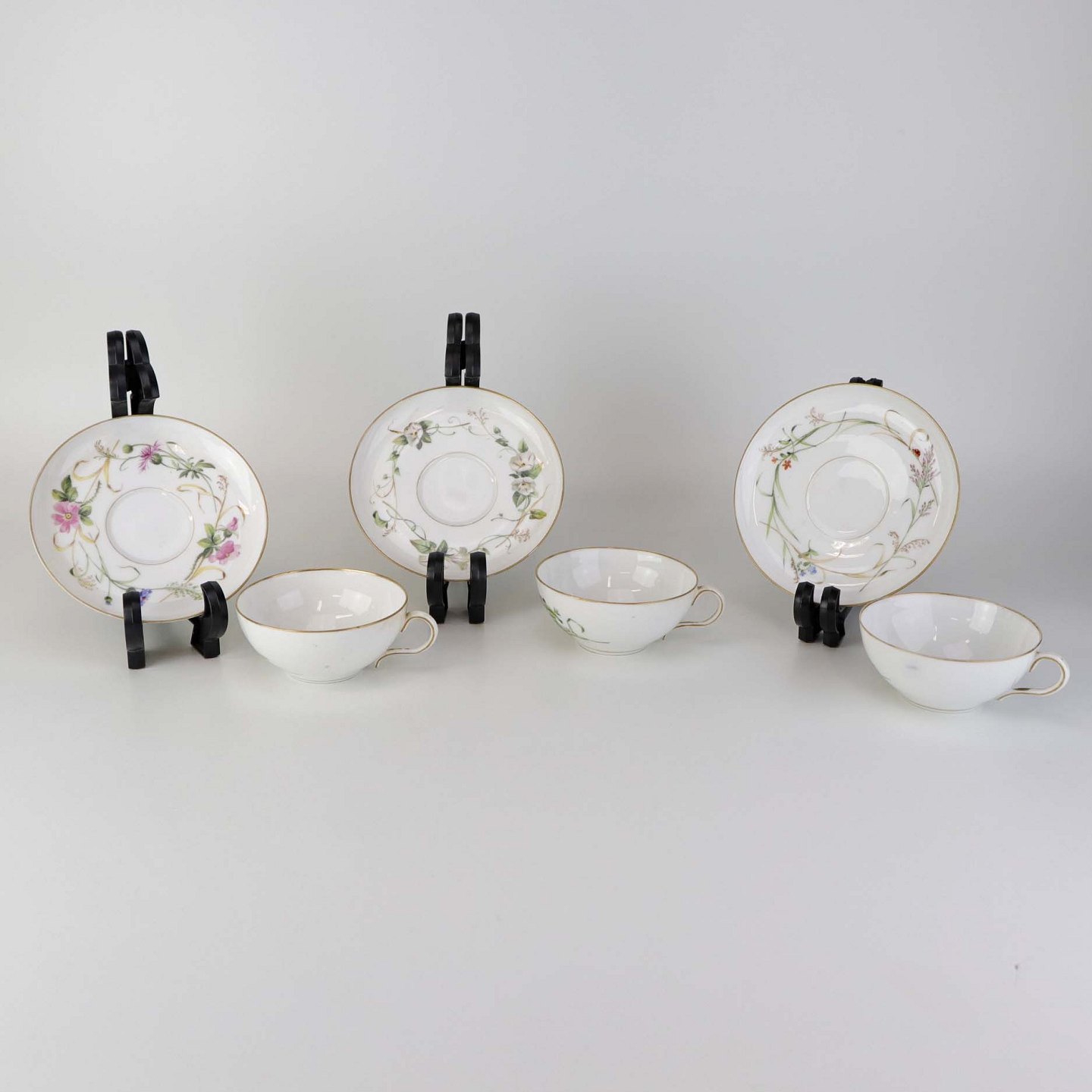 Sæt med fem styk kaffekopper og tre styk underkopper i porcelæn med håndmalede blomstermotiver og guldkant. Stellet fra ca 1850.
