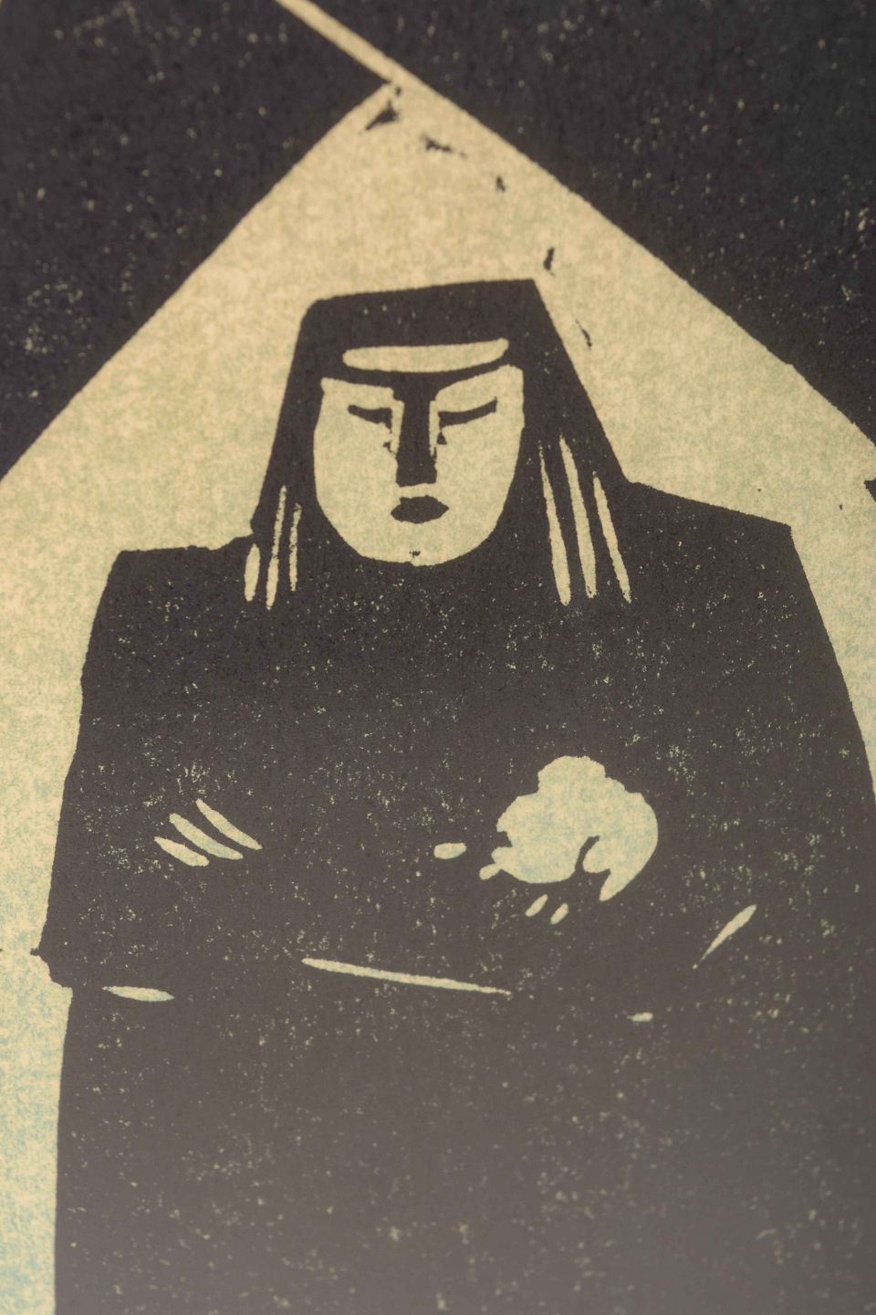 Et karakteristisk træsnit af den svenske keramiker og billedkunstner Åke Holm, udført i hans særlige ekspressive stil med bibelsk motiv.