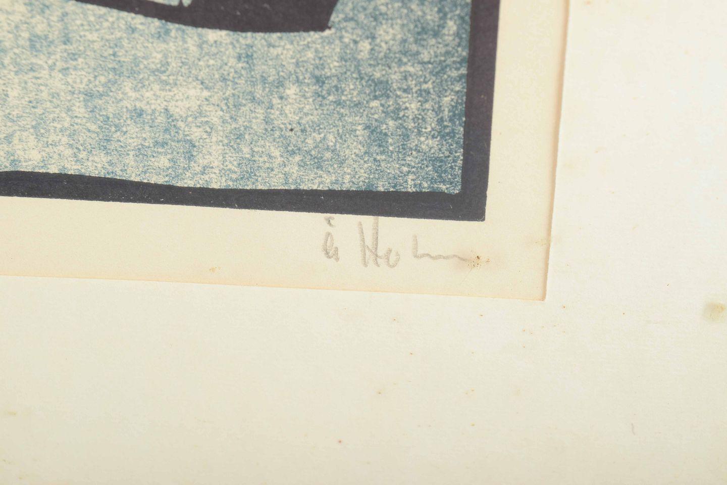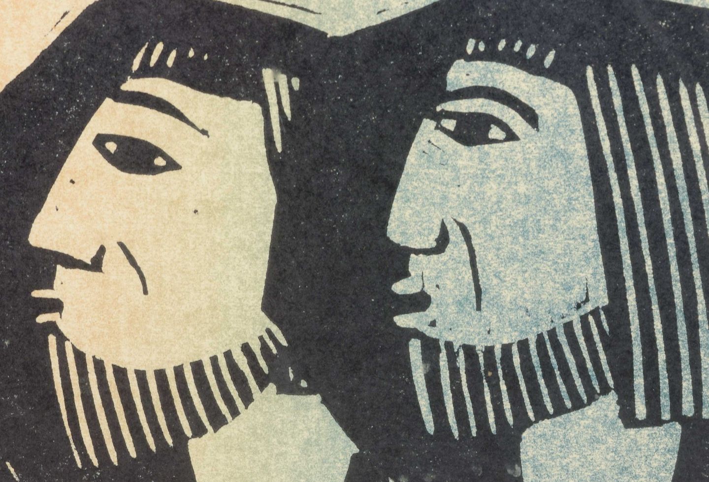 Et karakteristisk grafisk blad af den svenske billedkunstner og keramiker Åke Holm, kendt for sine ekspressive, stiliserede kompositioner med religiøse og figurative motiver.