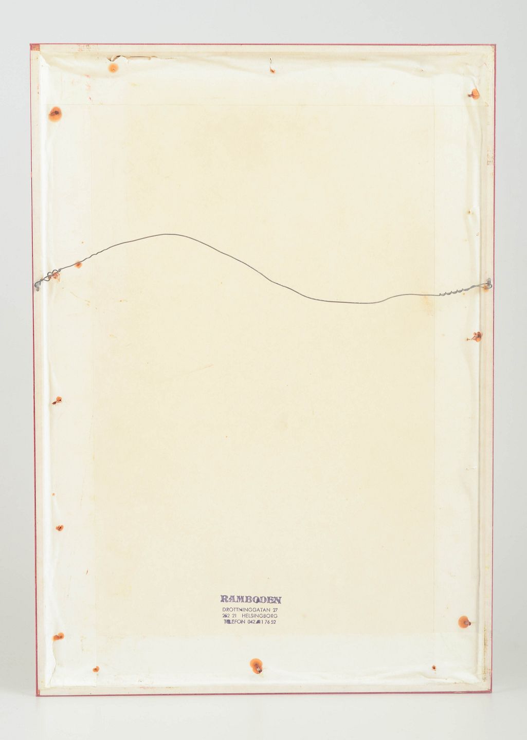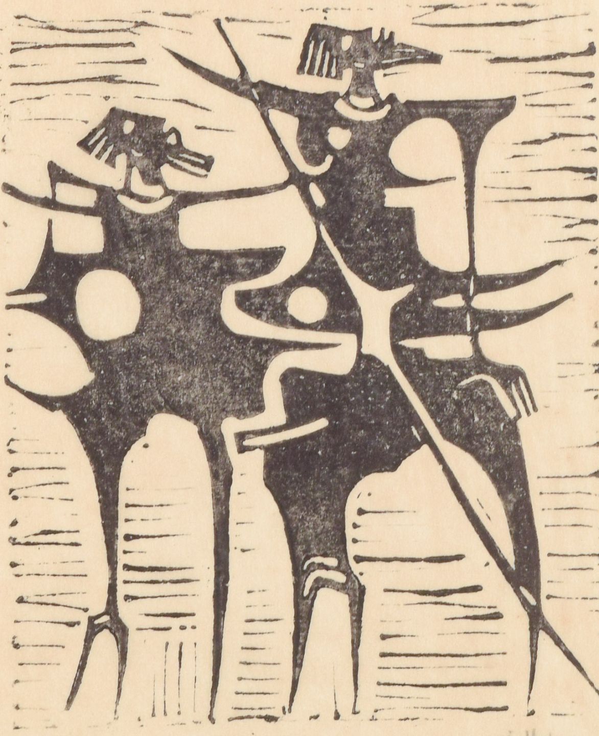 Et karakteristisk grafisk blad af den svenske billedhugger og keramiker Åke Holm, der især er kendt for sine ekspressive keramikfigurer og grafiske arbejder med bibelske og abstrakte motiver.