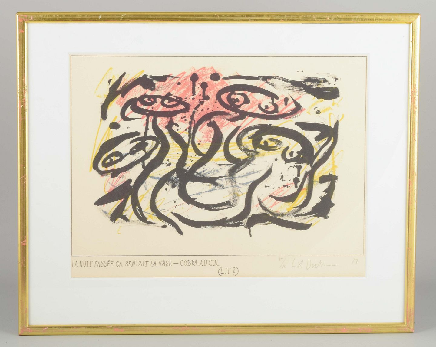 Et karakteristisk litografi af Erik Dietman, skabt i 1977 og udført i et oplag på 75 eksemplarer. Værket er typisk for Dietmans spontane, humoristiske og organiske billedsprog, der ofte leger med Cobra-bevægelsens arv.
