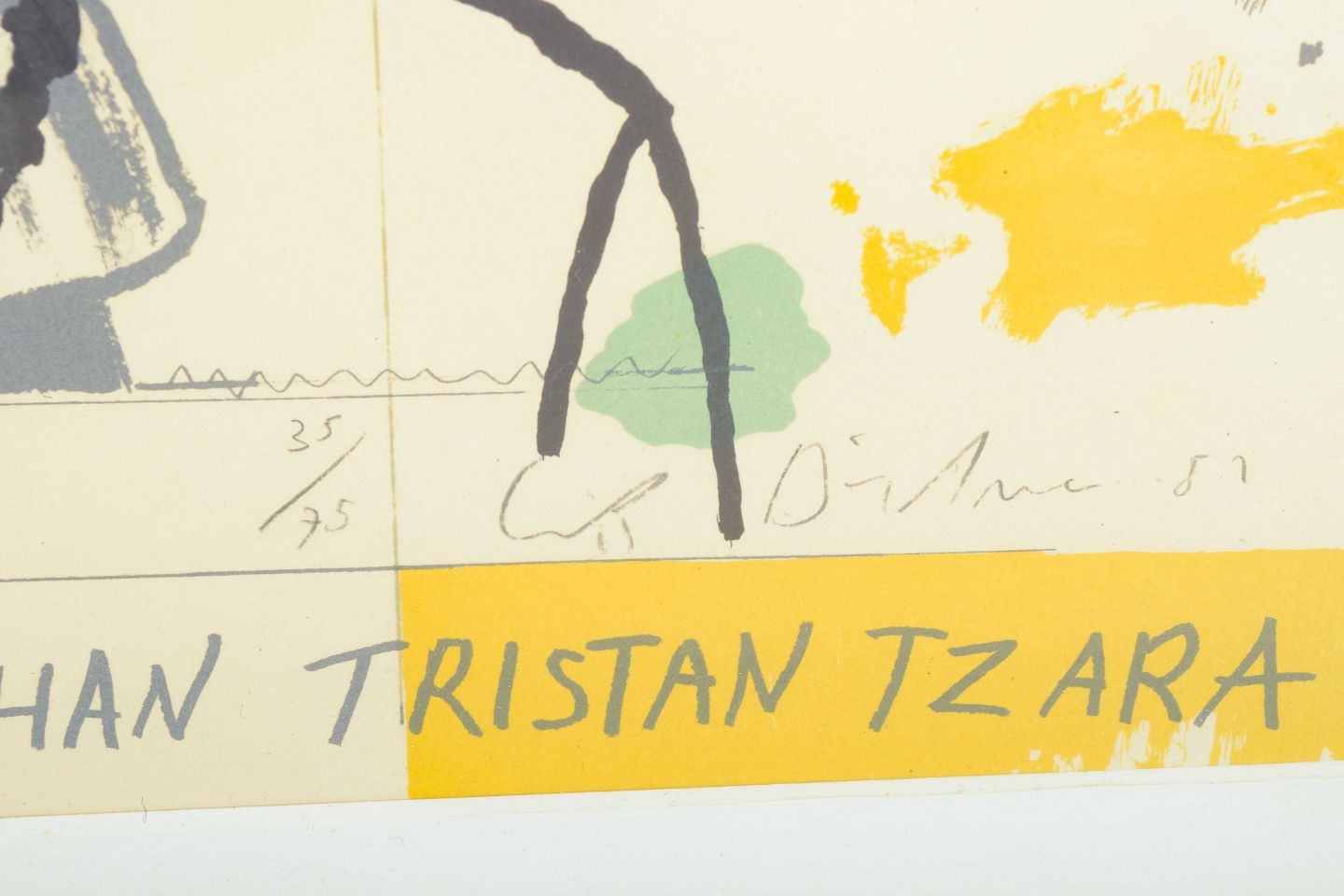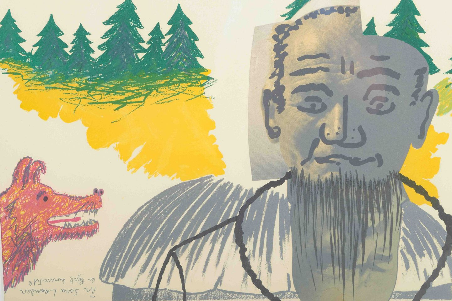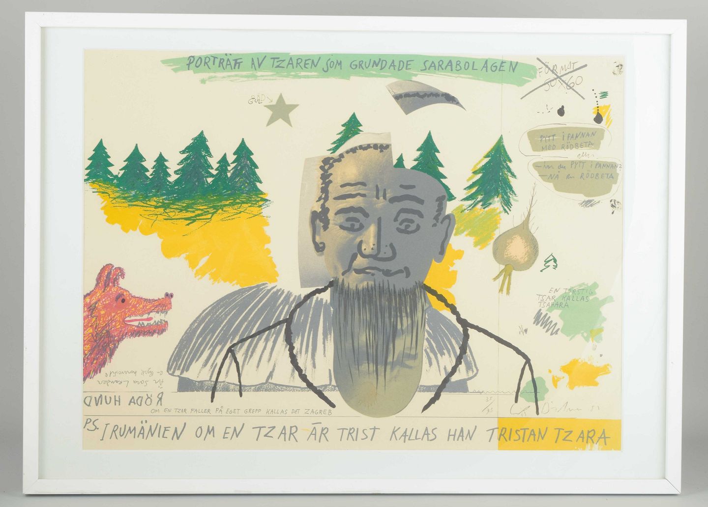 Et karakteristisk litografi af Erik Dietman med motivet “Tzar Tristan”, hvor hund, løg og fyrretræer optræder i en surrealistisk komposition.