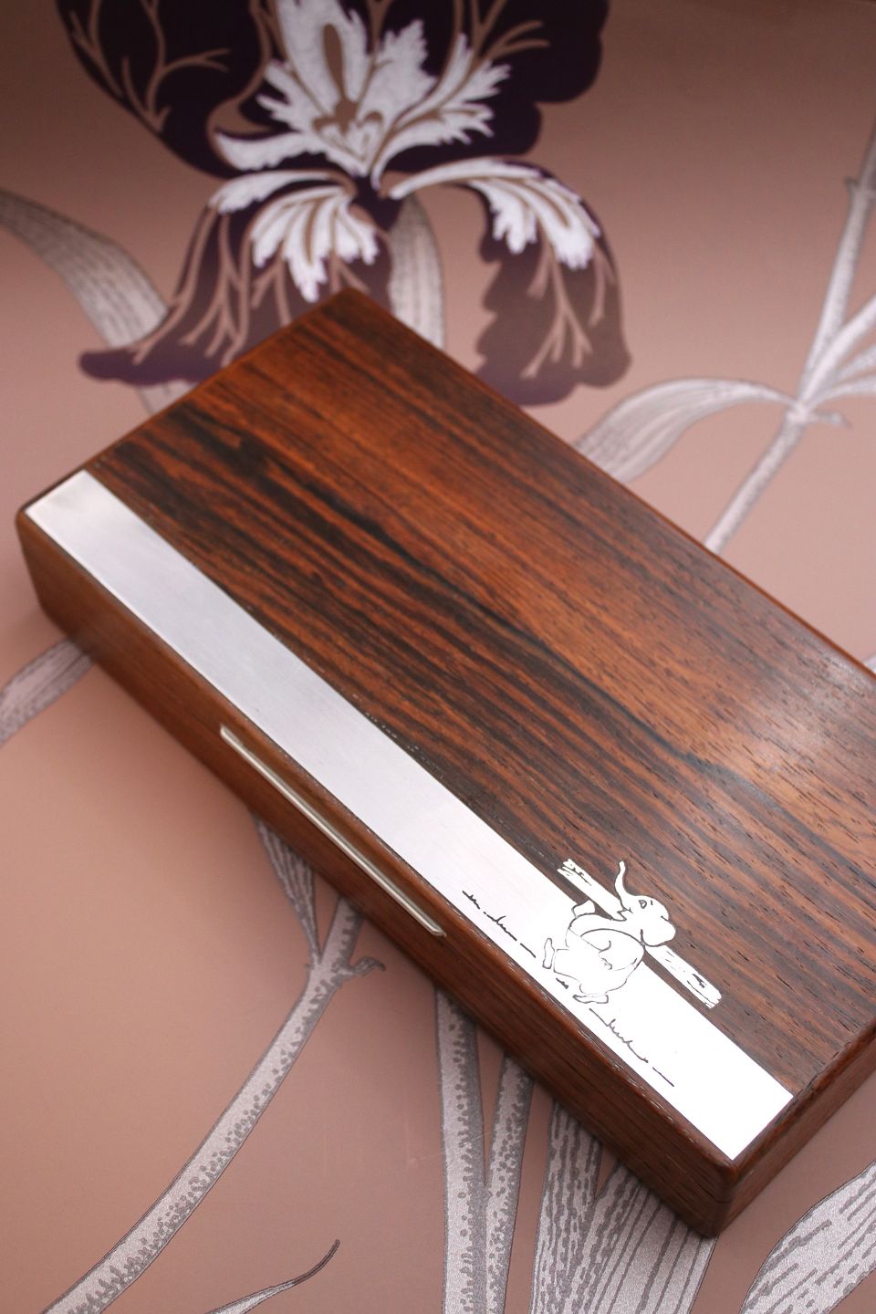 Aflang æske i palisander dekoreret med sølv indlægning med motiv af lille elefant som bære en træstamme på skulderen.