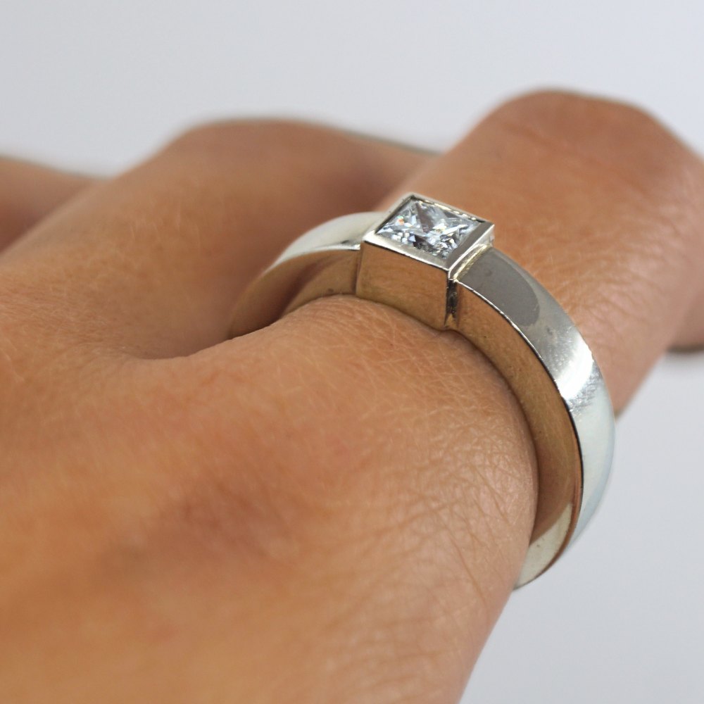 Birgitte Munch; Kraftig diamantring i 14 kt. hvidguld med 0,60 ct. diamant. Farve: Top Wesselton. Klarhed: VVS. Ring str. 55. Stemplet "BRM 585". Virkelig lækker kraftig ring.